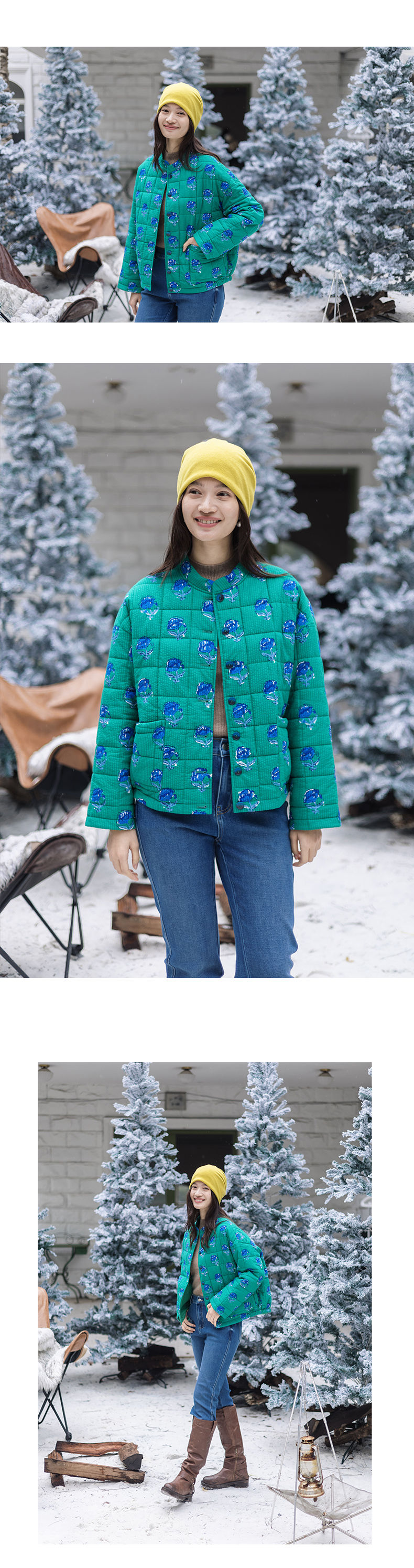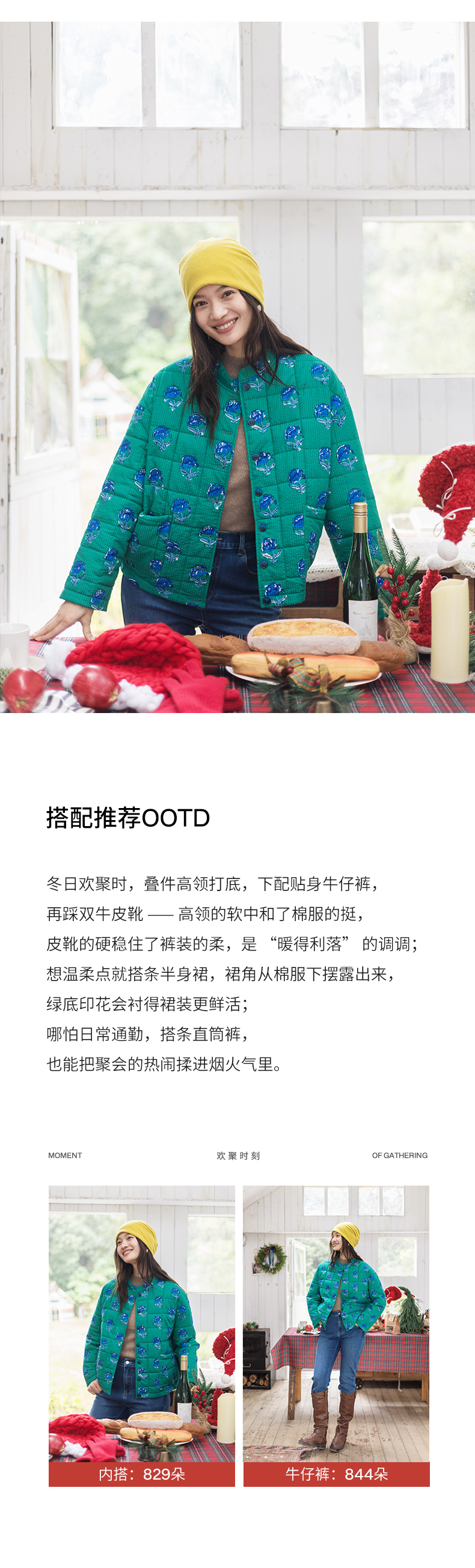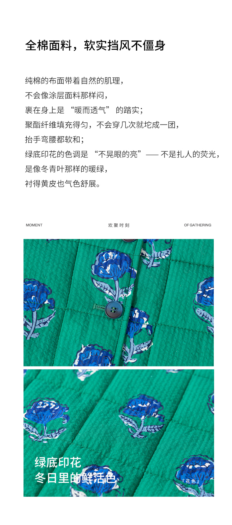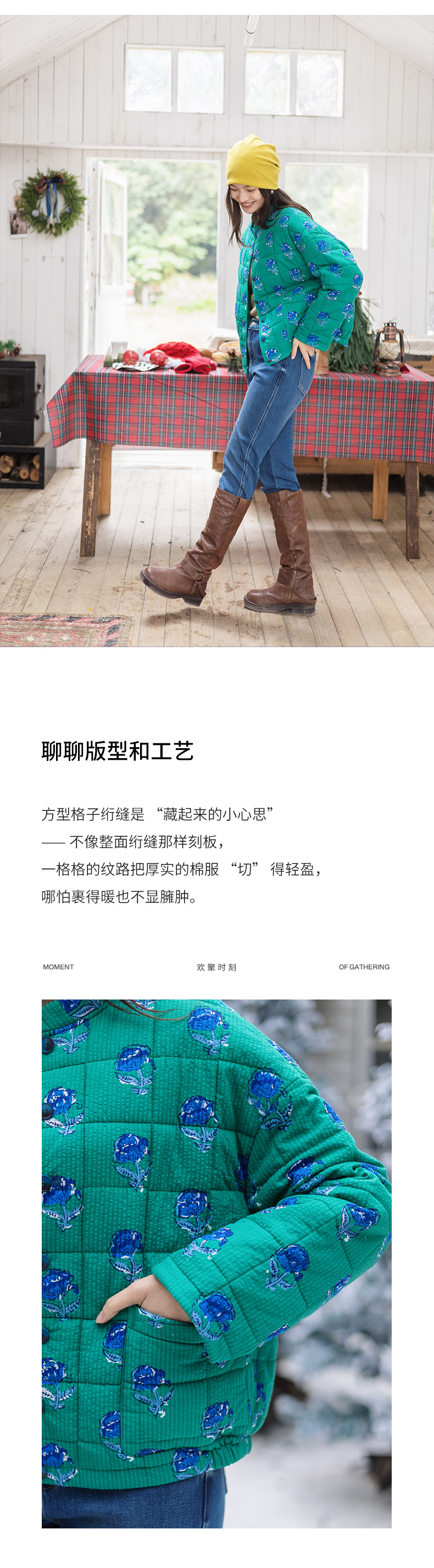 特绽放853朵/暖绿印花方格短棉服·全棉加厚保暖显高短款圆领棉衣