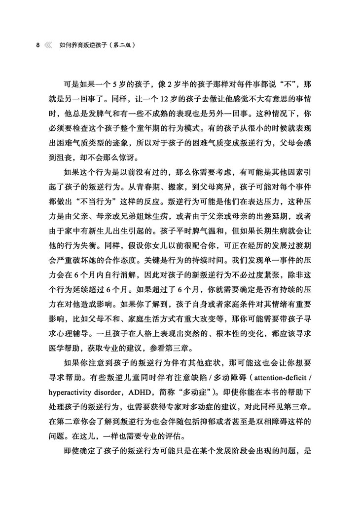 很多家长在遇到孩子叛逆时束手无策,这本书给出了非常详细的指导步骤,无疑会有助于家长教养实践的良性循环,但所有教养方法都需要在和自己孩子的互动中磨合完善。建议家长们在学习和使用的过程中,抓住其中的精髓,如陪伴、关注、积极反馈、适当管教等,举一反三,形成一套自己的8步或10步法,这样成功的可能性会更高,成就感也会更强,共勉!