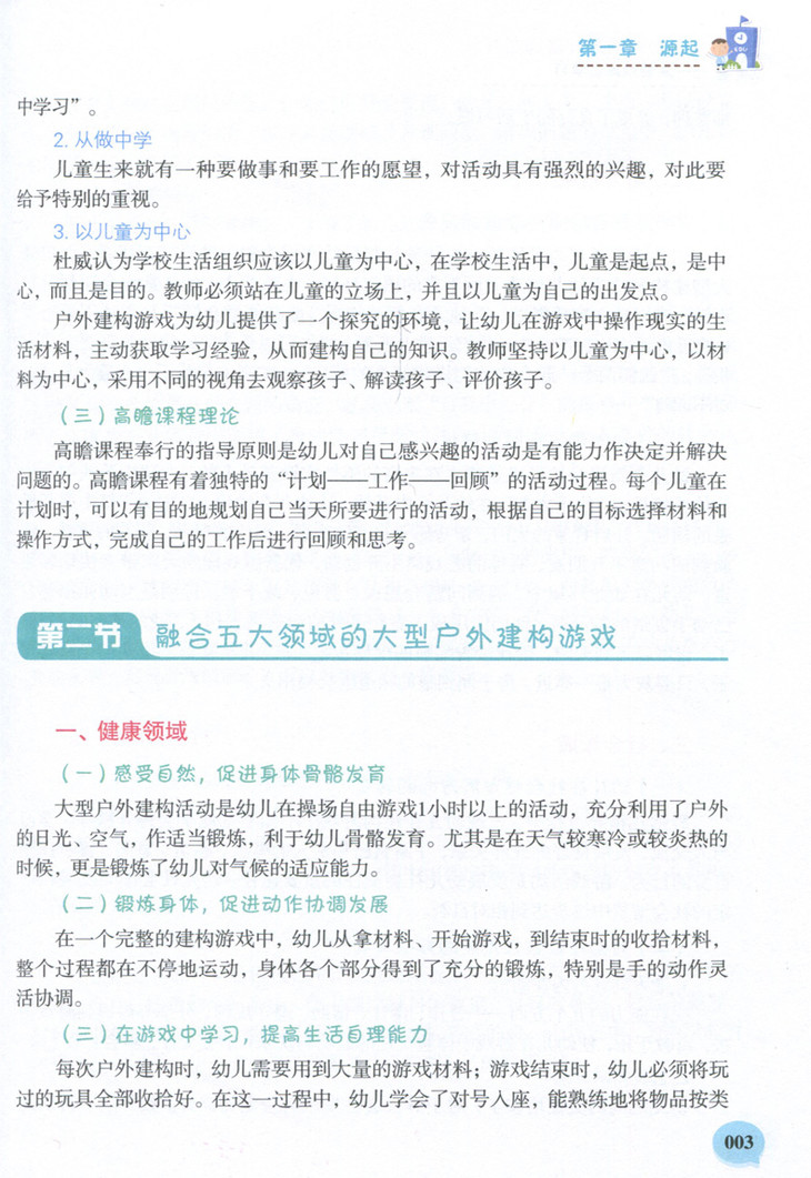 将区域活动作为串联教育活动、生活活动和游戏活动的一条主线。一共五章,第一章主要阐述户外区域化环境对幼儿生命的意义和身心发展的重要作用;第二章承接了我园环境和区域教育活动的理念和实践,并对相关的概念进行了解析;第三章是户外区域混龄活动的主体部分;第四章以创新的视角重新来审视愉快课程的内涵;第五章是户外区域混龄活动的评价。