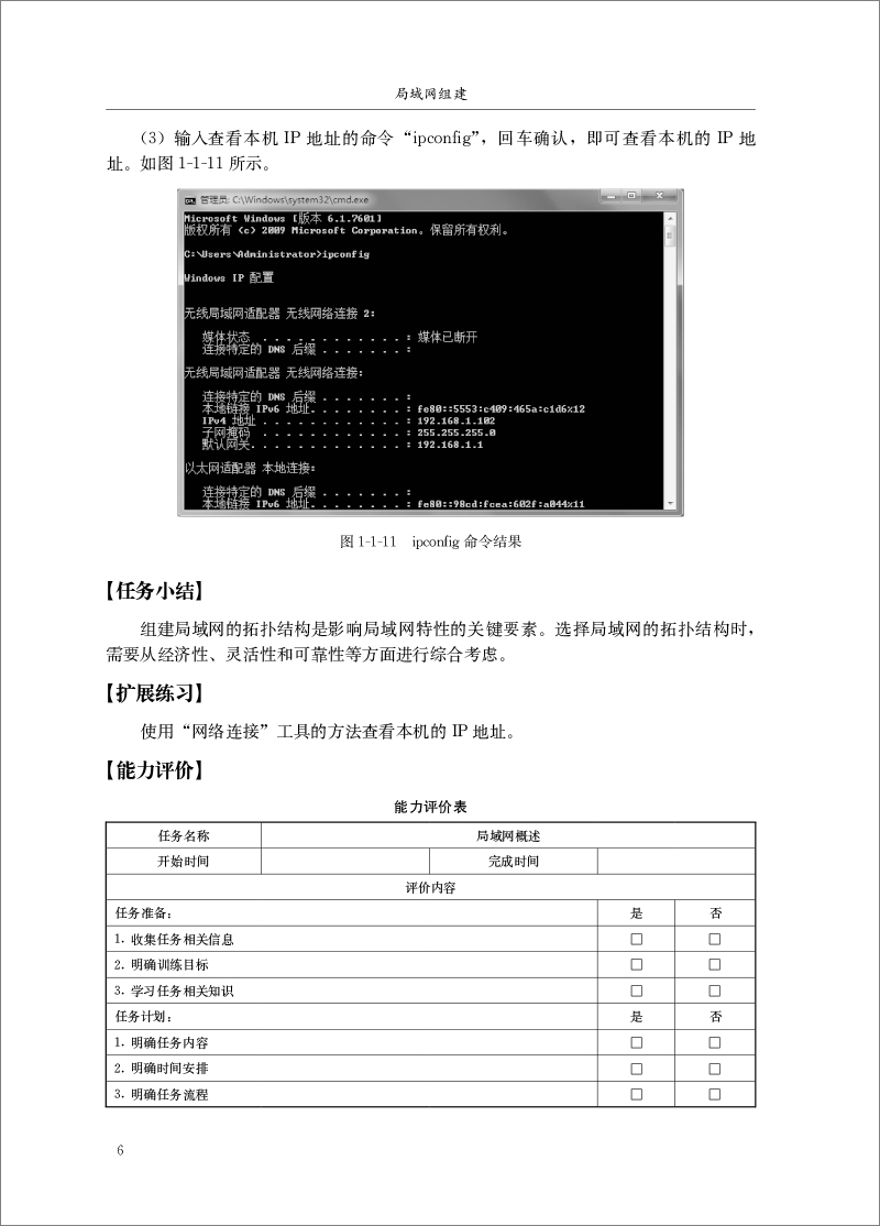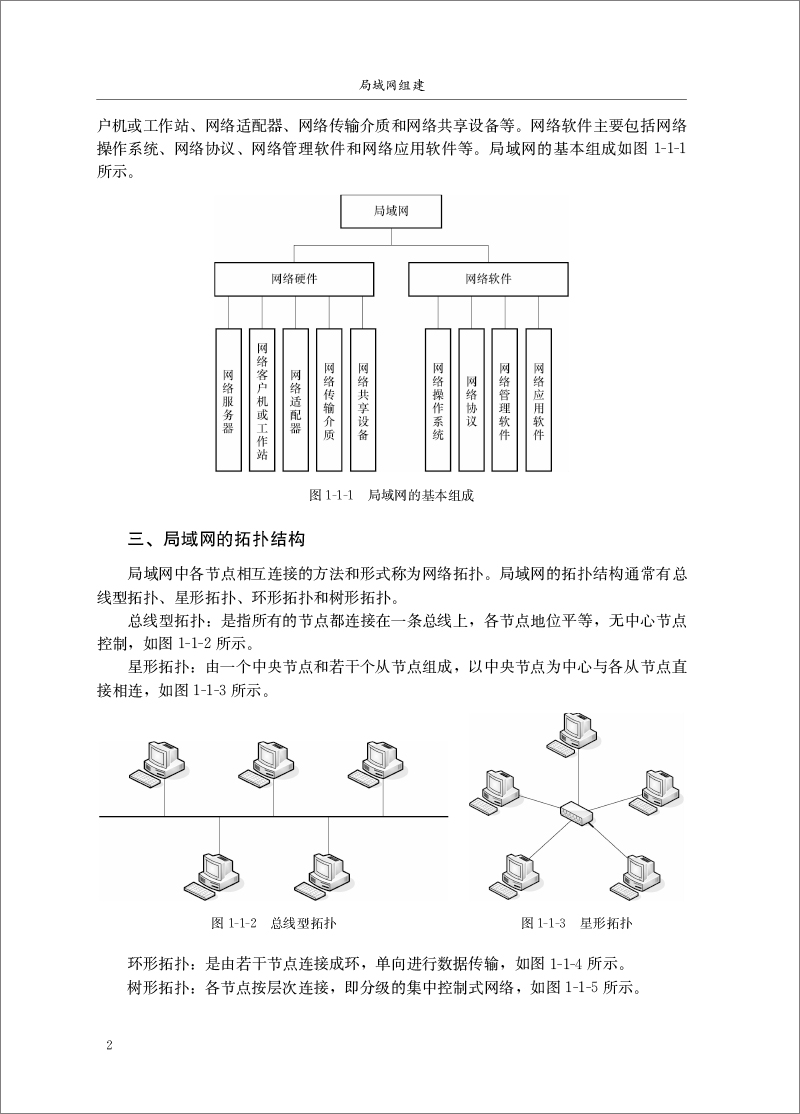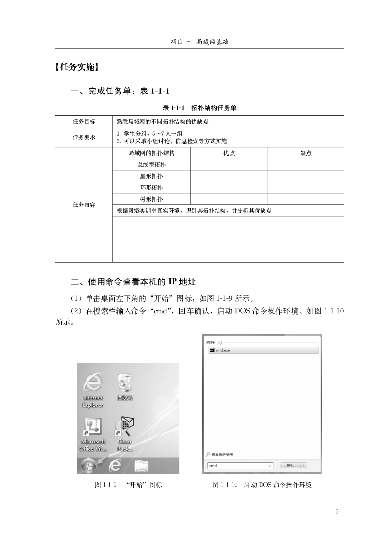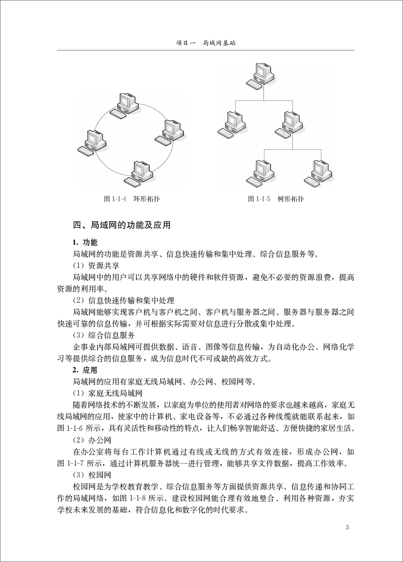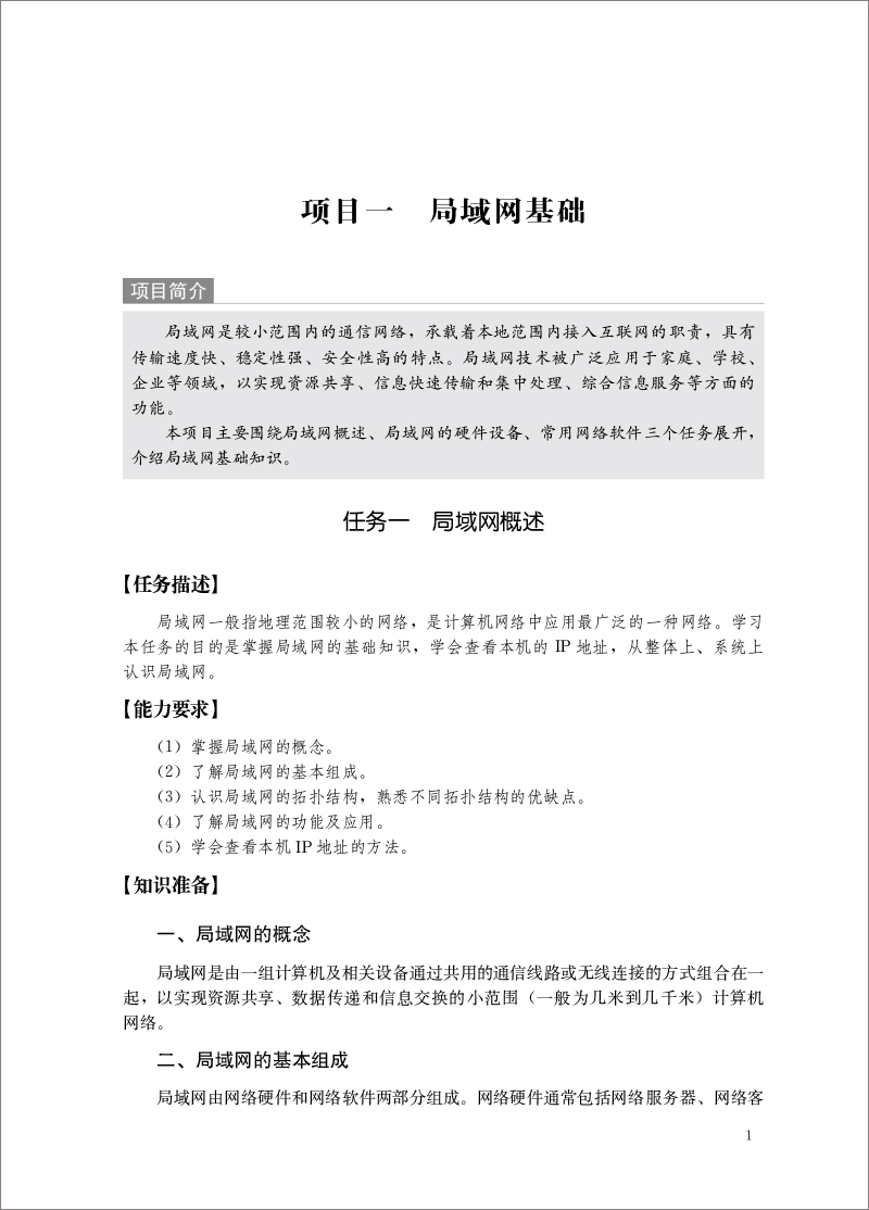 项目一是局域网基础,简要介绍了局域网的应用、局域网的拓扑结构、局域网组成的硬件设备和常用网络软件。