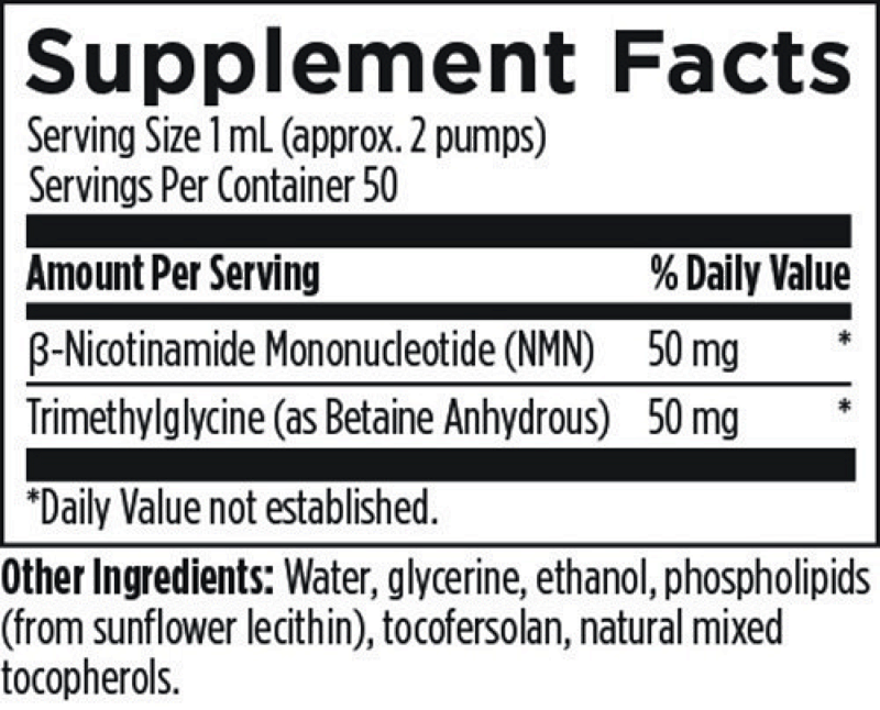 每1毫升的脂质体 Liposomal NMN Synergy 可提供50毫克的NMN和50毫克的TMG。