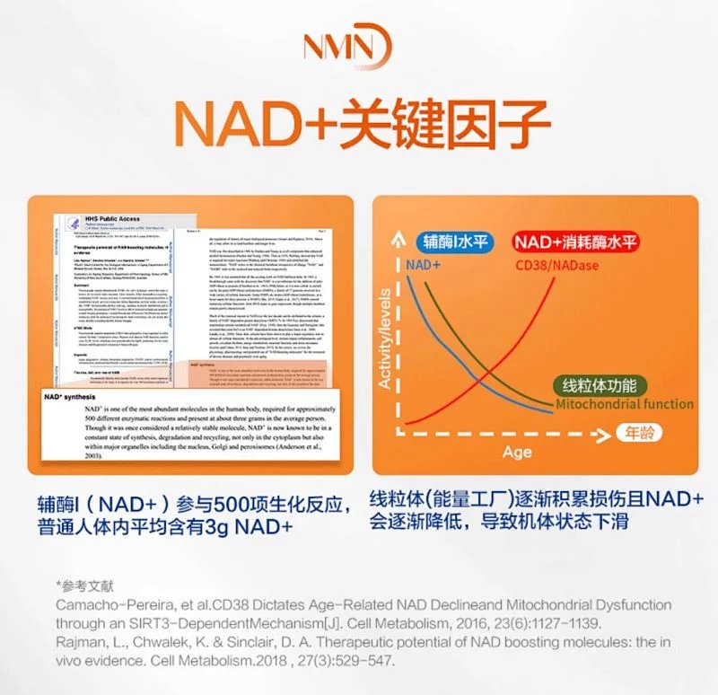 NMN和NAD +的水平都随着年龄的增长而下降。 我们的公式基于科学突破,表明NMN可以直接转运到所有细胞中。