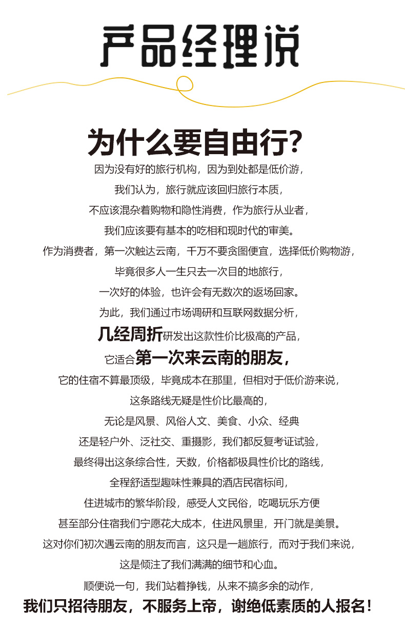 ▷交通:不包含各地到达丽江/昆明集散的往返大交通费用(如:机票和高铁火车票等,提前预定通常折扣都会很低);