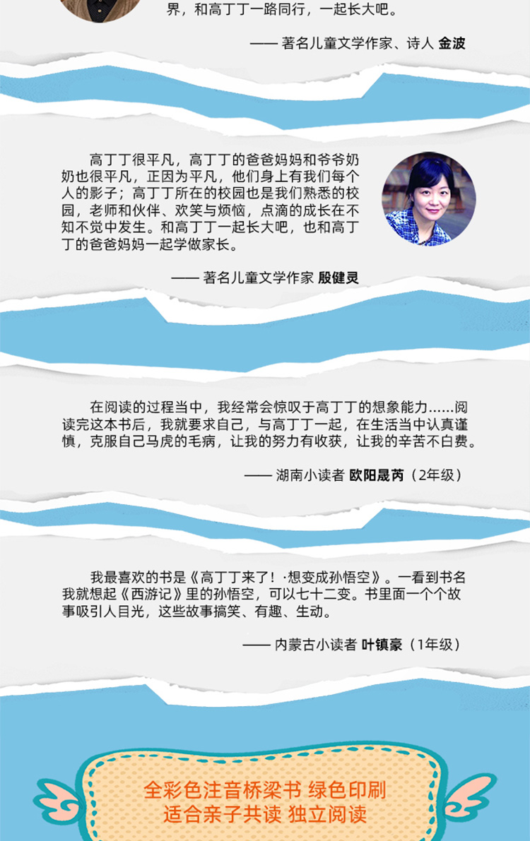 《高丁丁来啦!》是一套面向小学中低年级孩子的儿童成长小说,首批4册讲述高丁丁在一年级里发生的种种趣事,既有关家庭、学校生活,还有家校以外的社会生活。在可爱的高丁丁身上,小读者们可以看到自己的影子。