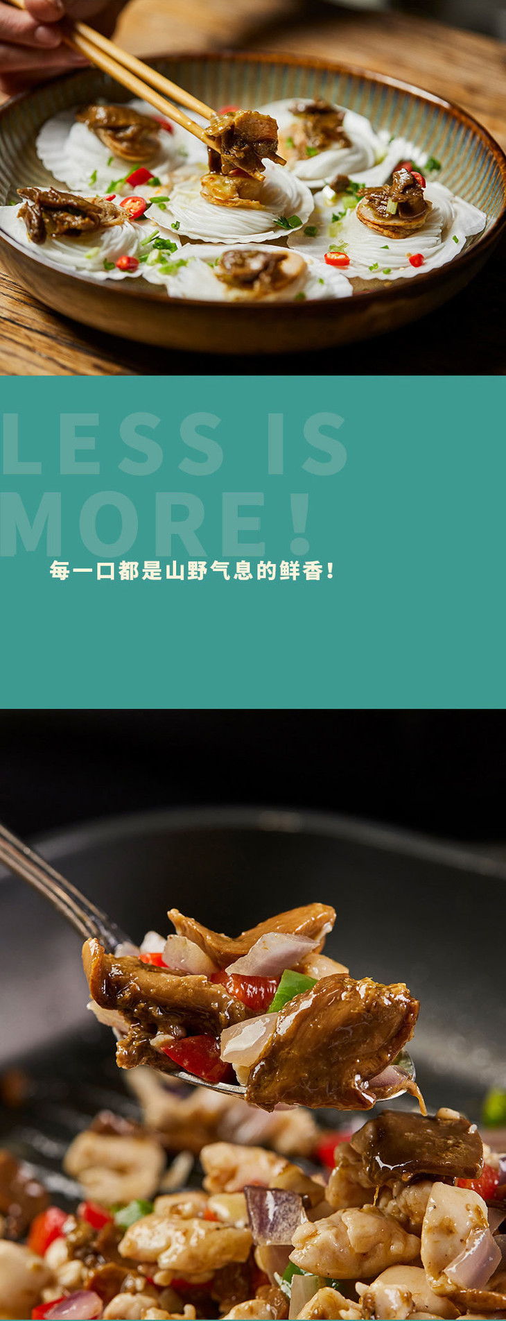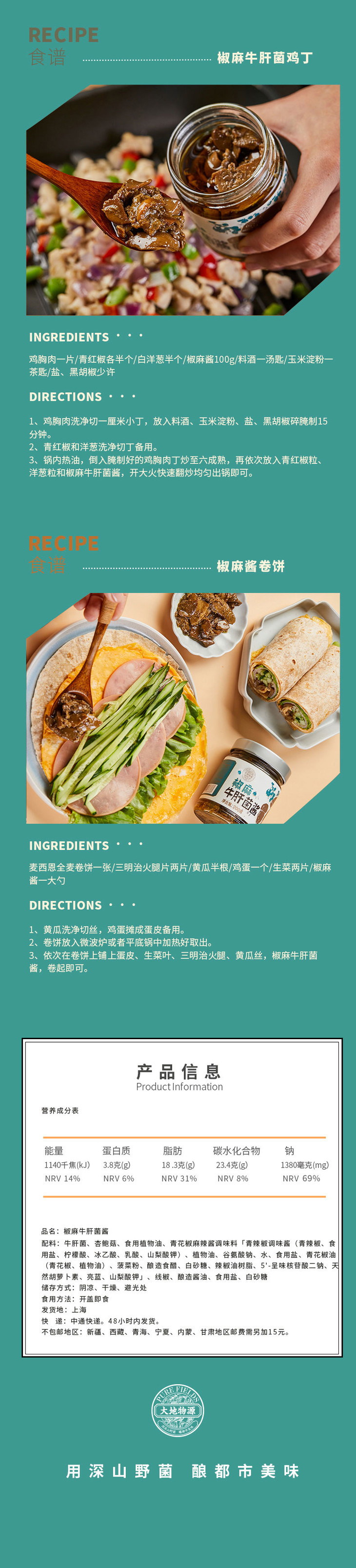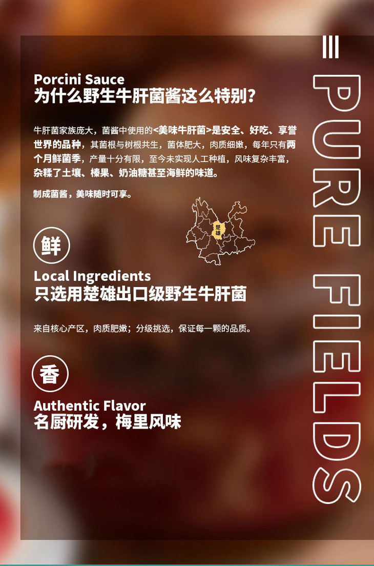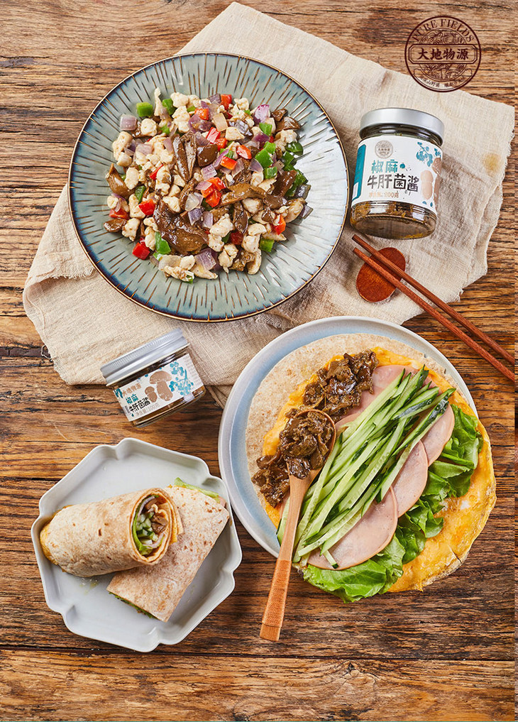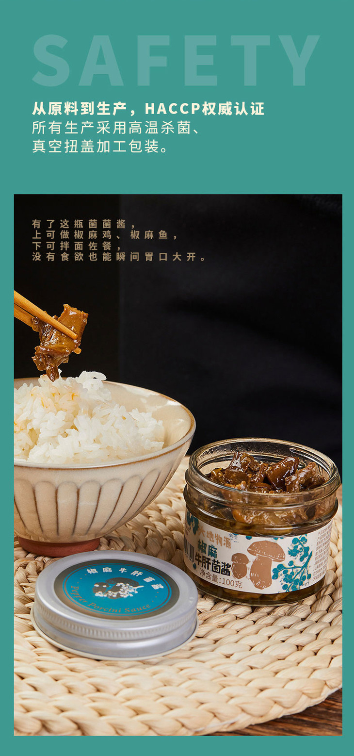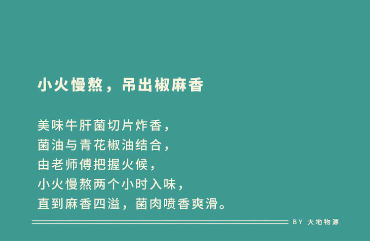 大地物源本身是做菌子进出口的,能搞定不少一手的菌子货源,用料不要太舍得!云南牛肝菌核心产区楚雄的菌子菌盖厚实,风味独特,出口级别野生牛肝菌,经过专人采摘,加上完整冷链运输,新鲜度爆表的菌子快速到达工厂,再经过人工挑选分拣肉质足够饱满的,才能开始制酱。制作时先挥发水分,再慢熬入味,让菌子保留脆嫩口感的同时,又充分吸收汁水的味道,可以说是在菌香和口感之间找到了很棒的平衡,才能吃出最迷人的土壤、榛果、奶油糖甚至贝类的风味!菌子本身够好、够鲜,所以能自信到不放味精、鸡精,连防腐剂都没有,配料表干净得仿佛自家做菜!