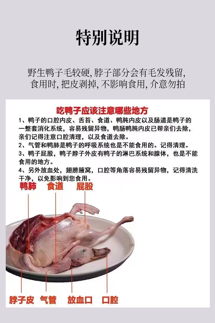 3.所有发货野鸭皆为12个月以上老野鸭。杀完冷冻24小时后发货。