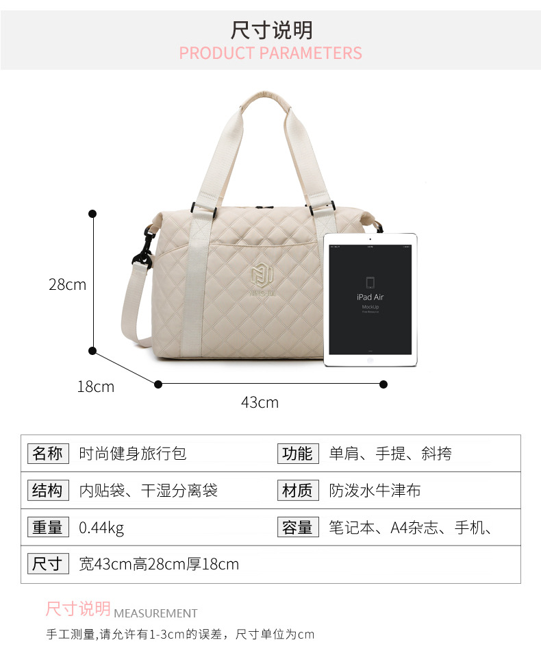 【菱格旅游行李包】韩版斜跨健身包 轻便高级感大容量旅行收纳包 国庆出游必备