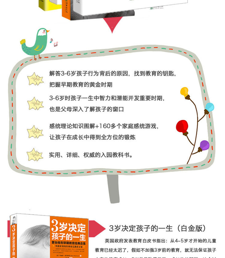 《3岁决定孩子的一生(白金版)》首推蒙氏教育理论+实战合集,将蒙台梭利早教理论和方法进行全面诠释,让您迅速掌握蒙氏早教理念和精髓的同时,更好地了解儿童成长特性,并因材施教,从日常生活、感官、数学、语言、科学文化等各方面来全面提升孩子的综合素质!
