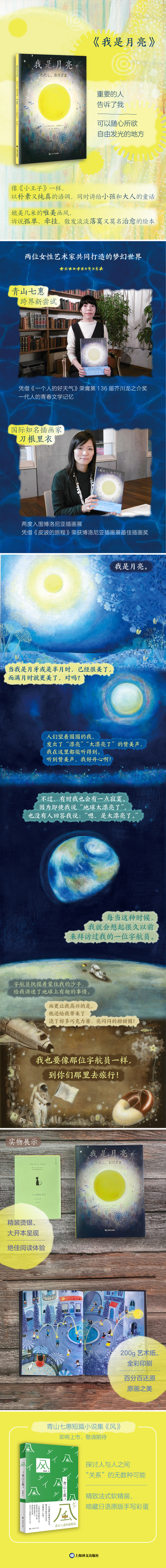 《我是月亮》是日本青年作家青山七惠撰文、青年插画家刀根里衣配图的绘本,讲述月亮到地球的一次旅行,月亮飞到地球,碰到孩子们,看到麦田,遇到猫咪、大鸟、大象,见到高楼、汽车,进入大海、沙漠,在游乐园里找到了拜访过月亮、已经变老、依然记得巧克力甜甜圈秘密的宇航员。月亮与地球,像是彼此不是非常熟悉却又相识已久的老朋友,在思量、对话,简单朴素的文字配合温暖有趣的图画,呈现出一部诉说孤单、牵挂,散发淡淡的落寞又有着莫名治愈感的读物。