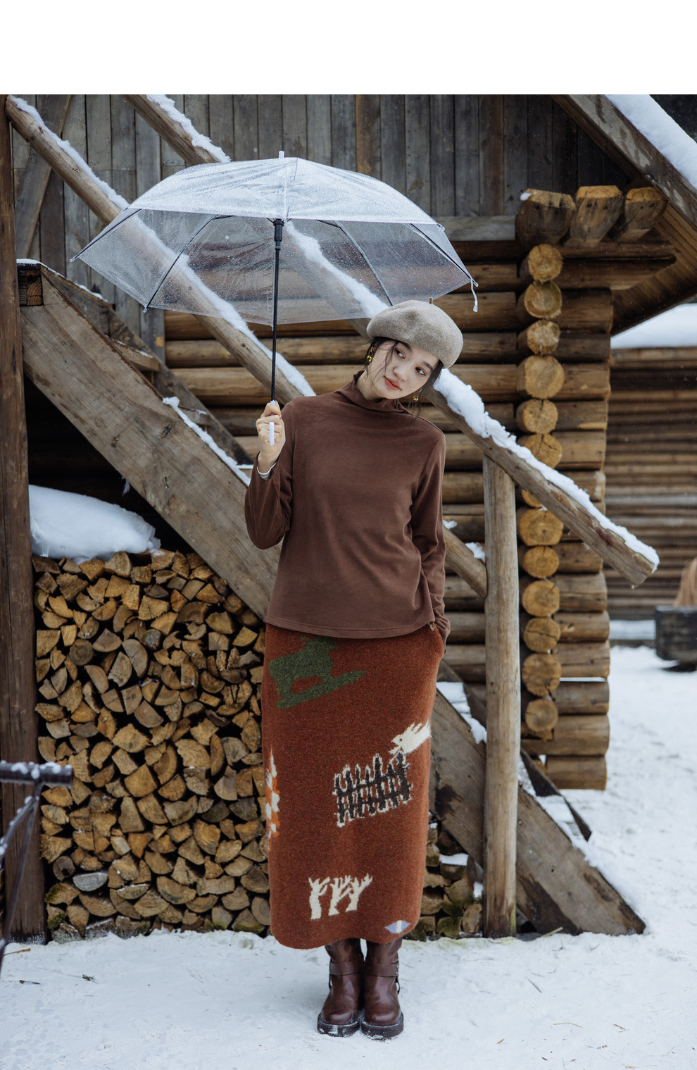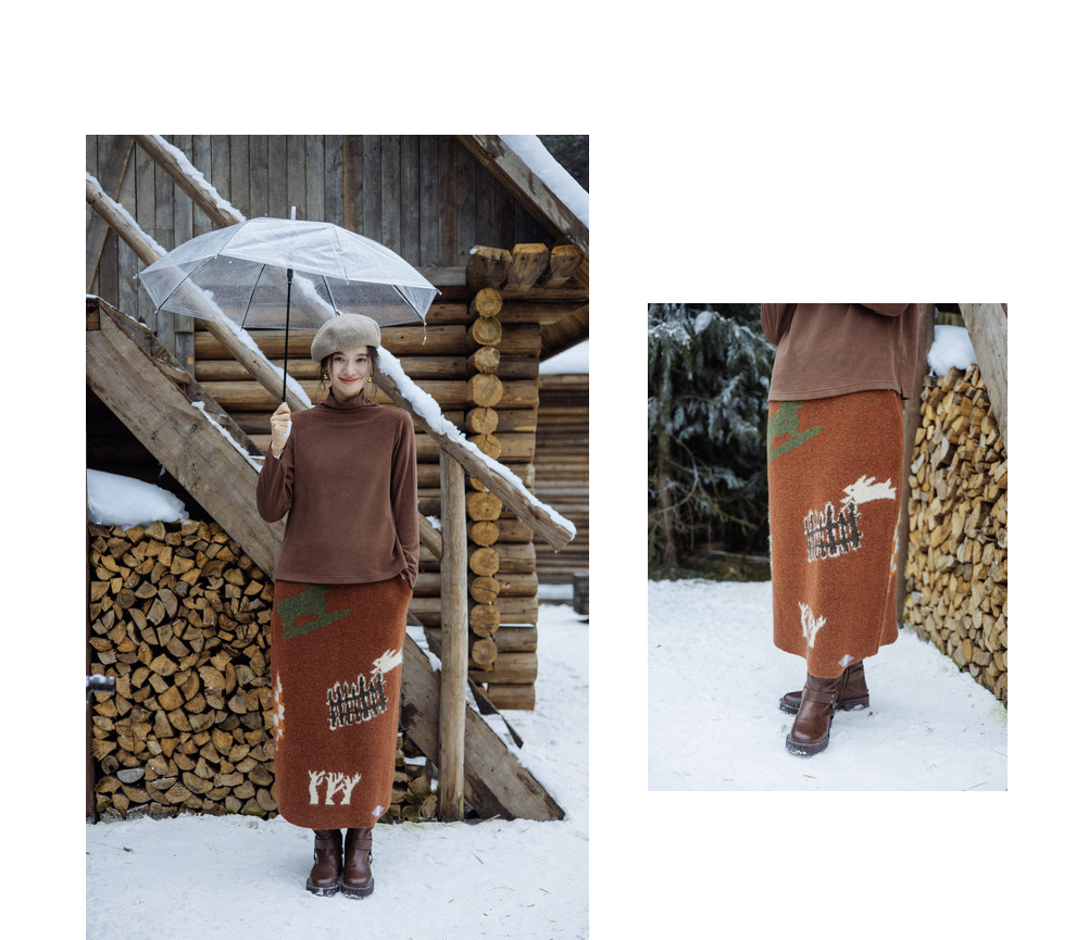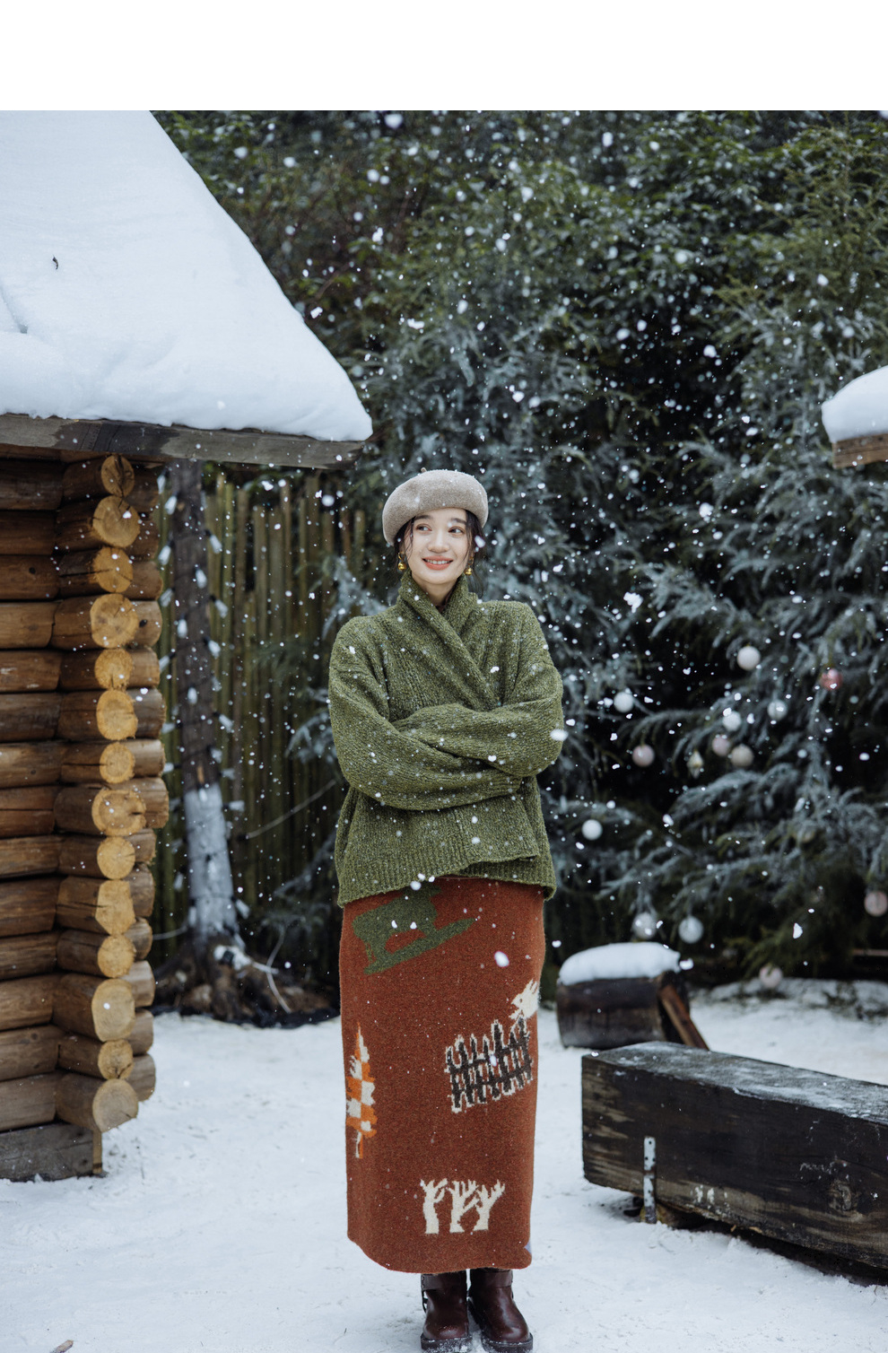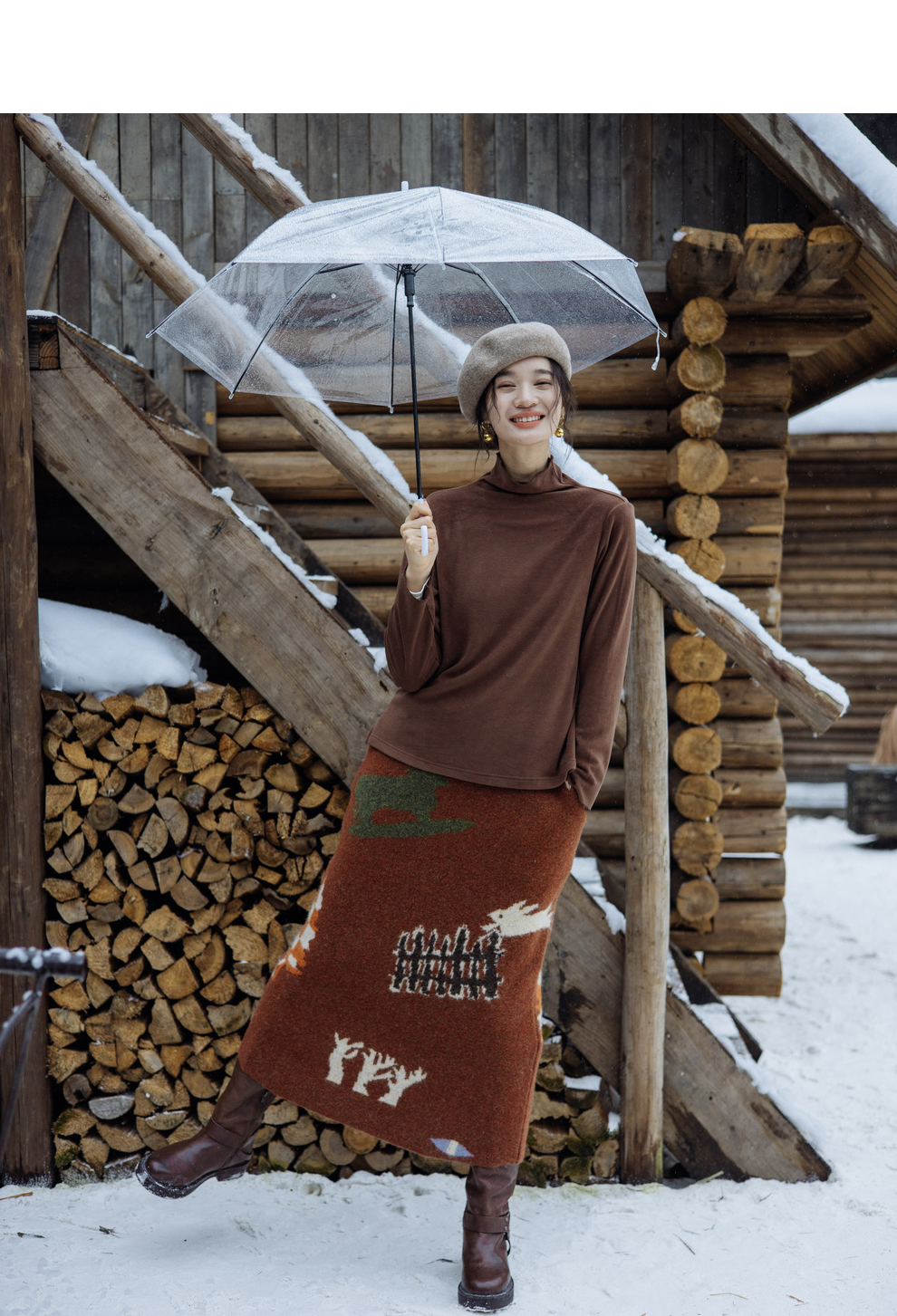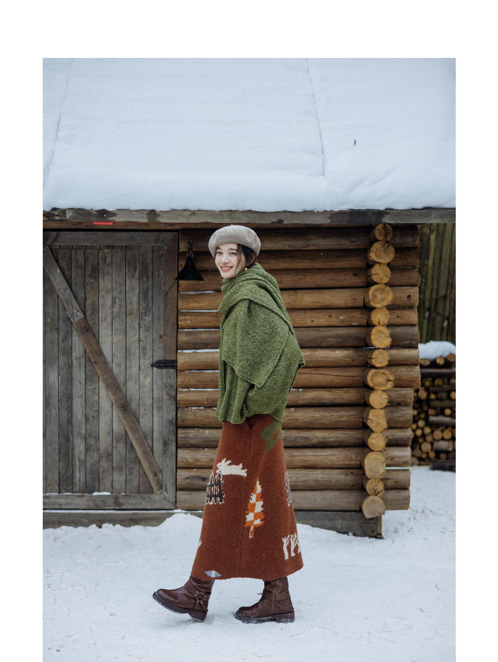 绽放832朵/羊毛卷冬牧场动物主题提花松紧腰百搭毛织半身中长裙