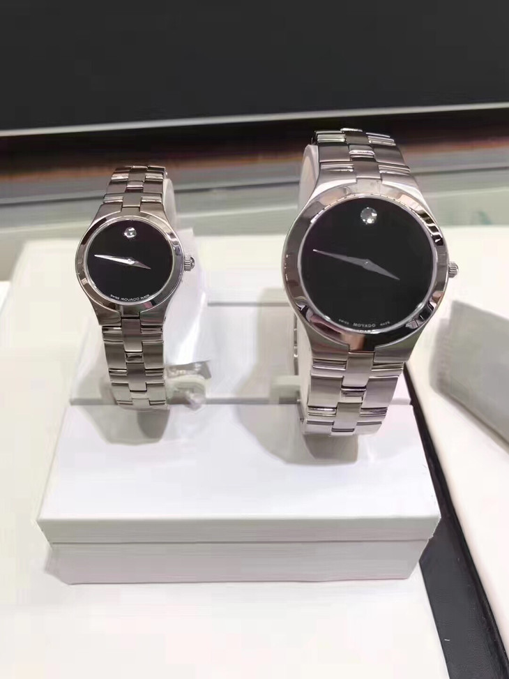 [玫瑰] 特价2980元包邮!Movado Juro 瑞士🇨🇭制造,石英对表。表镜为蓝宝石水晶玻璃防刮花。不锈钢表壳搭配精钢表链。固定不锈钢表圈。黑色表盘,银色的指针,Movado标志性圆点位于12点钟的位置。男盘表经为36mm,女表为24mm。防水30米/ 100英尺,两年国际机芯保修。