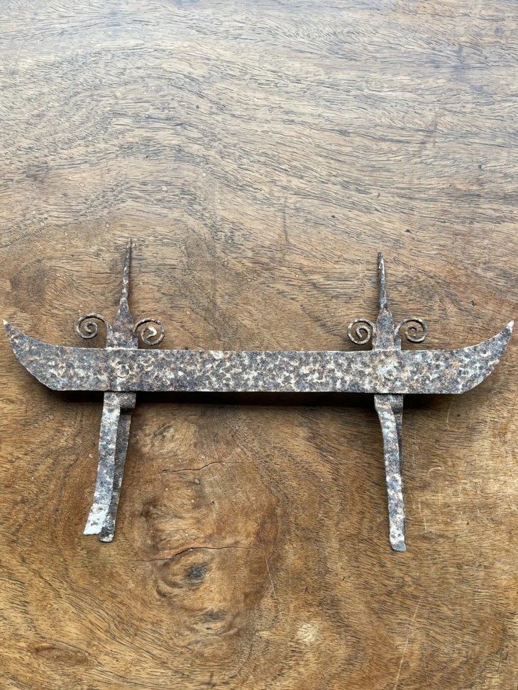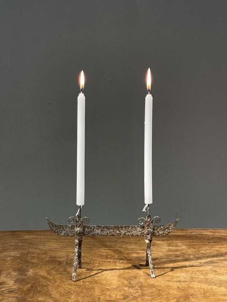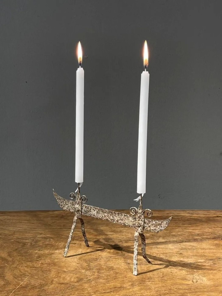 这是一件年代老的铁质拱门型蜡烛台,手工铸造捶打成形式简约、可以插两根蜡烛的拱门型蜡烛台,是的经典实用照明器具,也是居家摆设的优雅旧物。