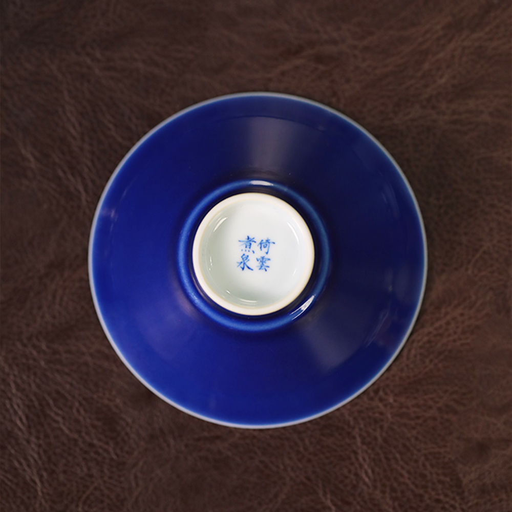倚云煮泉内模印宝石蓝斗笠杯-鱼藻纹