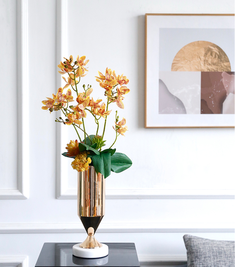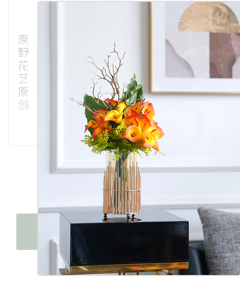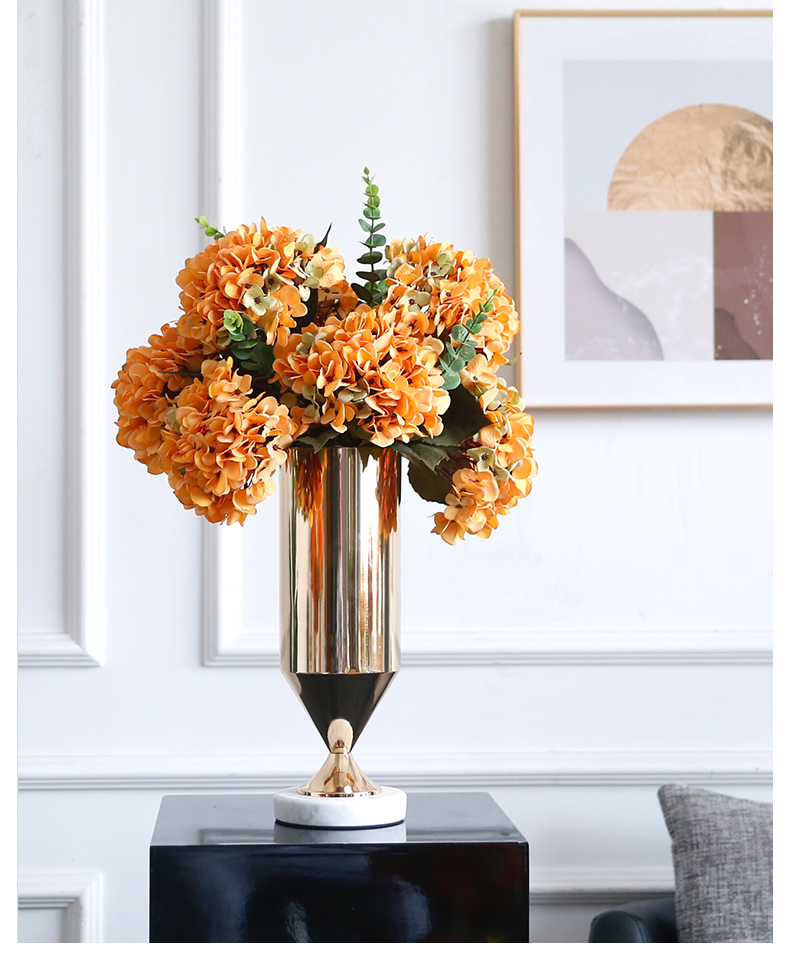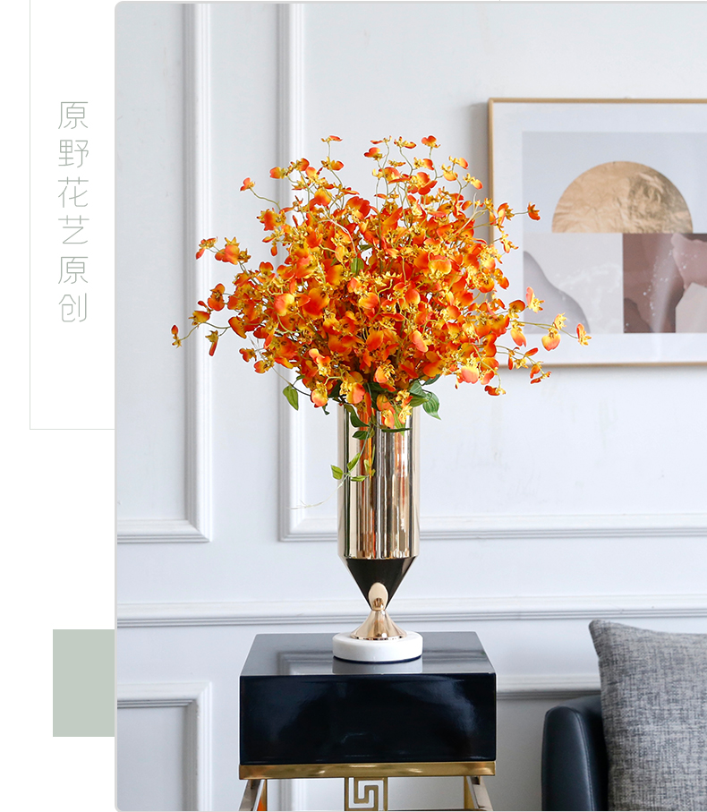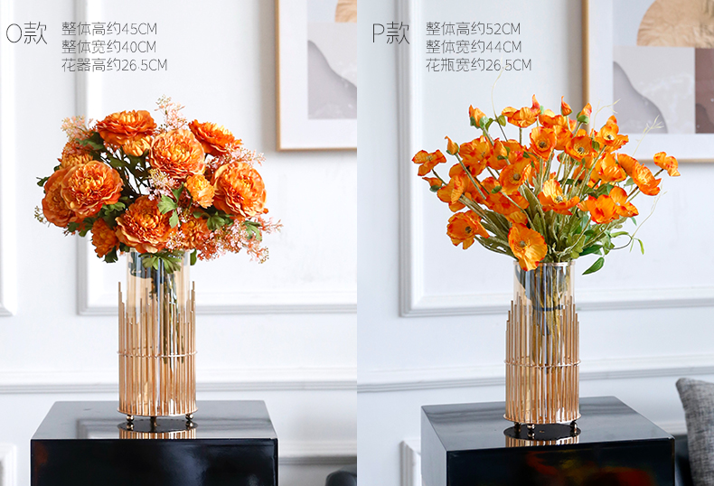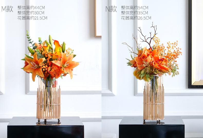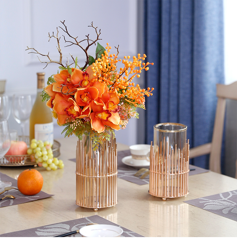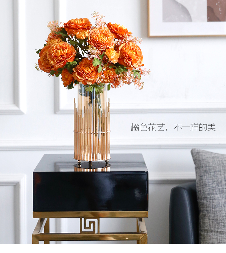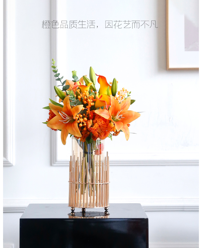 高档轻奢仿真花假花摆件餐桌酒店茶几橘橙金铜色花器瓶样板板房间