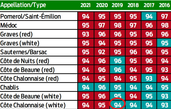 2019 年:WE 94 分,勃艮第干白史上好年份之一;