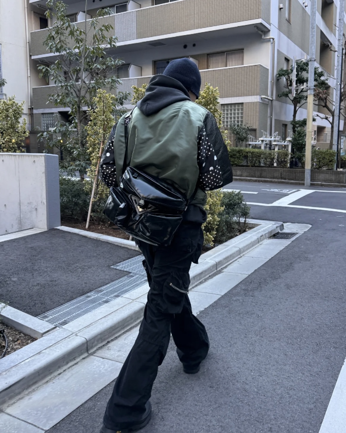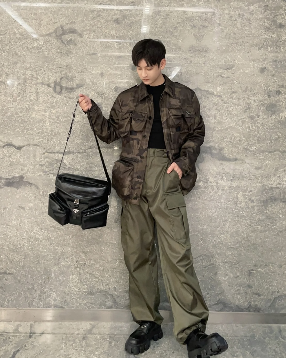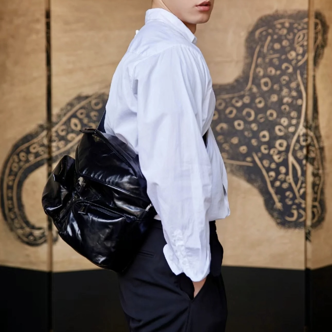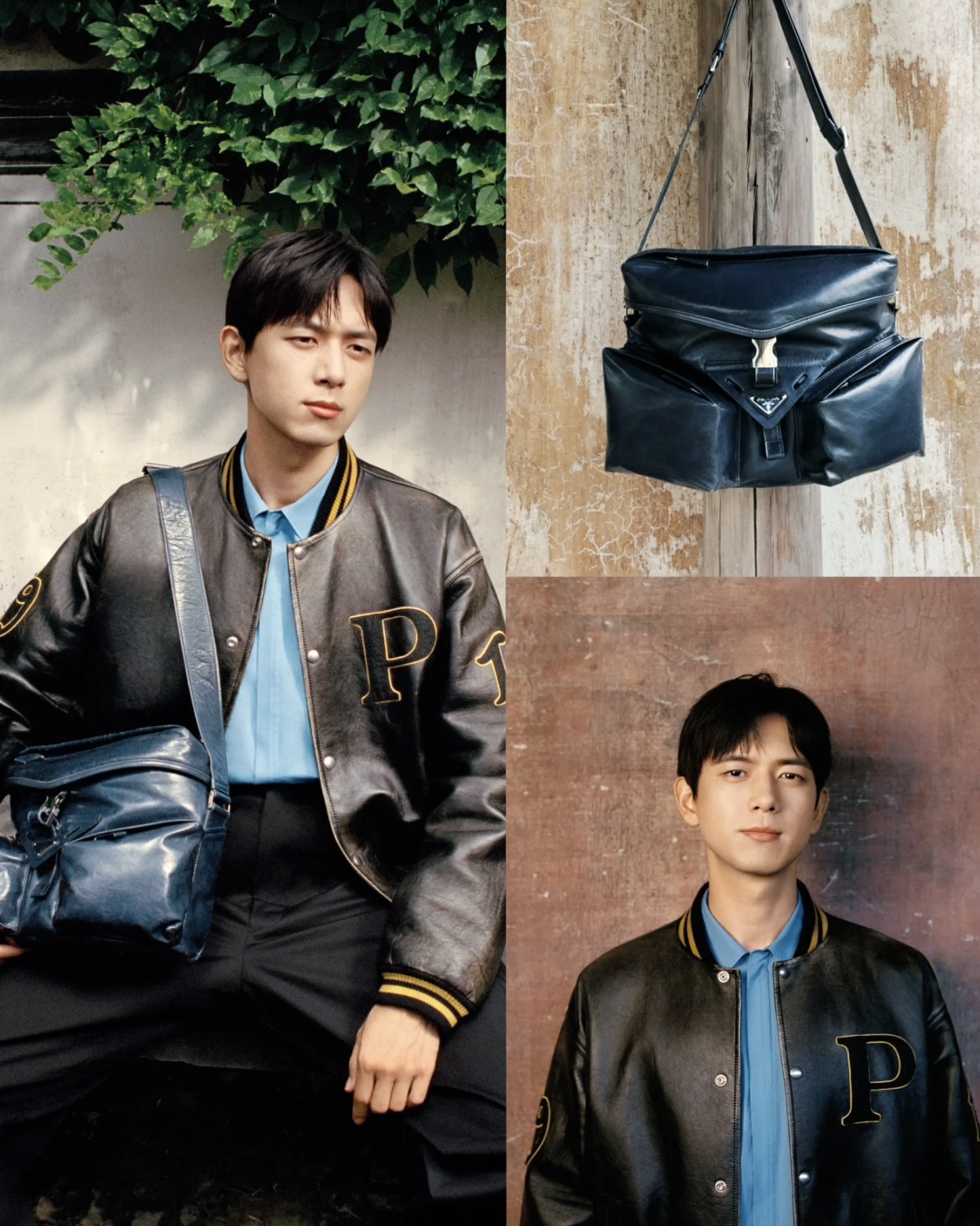 彰显建筑结构,带有大号工装口袋,采用斜裁设计,勾勒出中央的牛皮革三角形,点缀以标志性的涂珐琅三角形金属徽标。