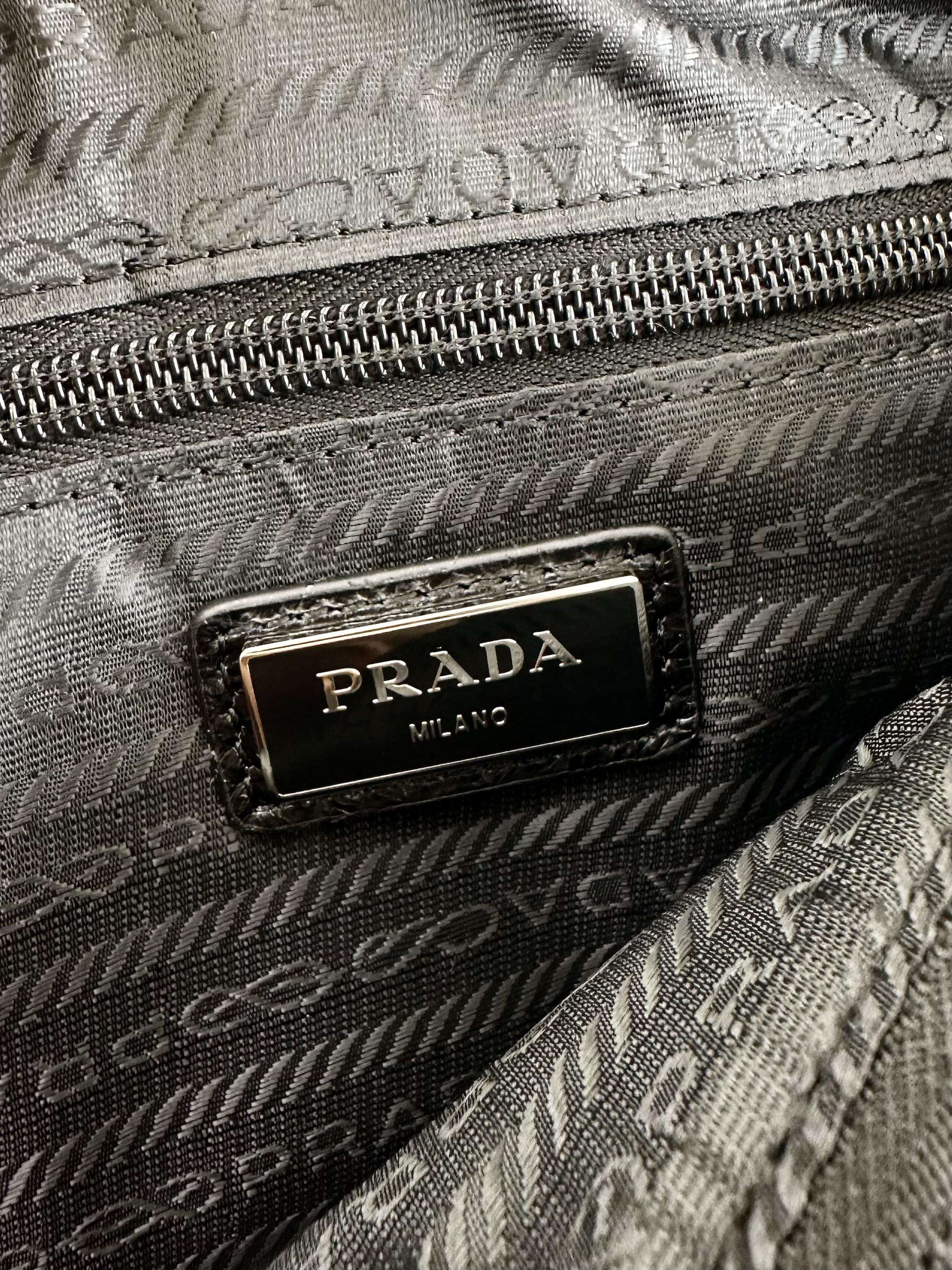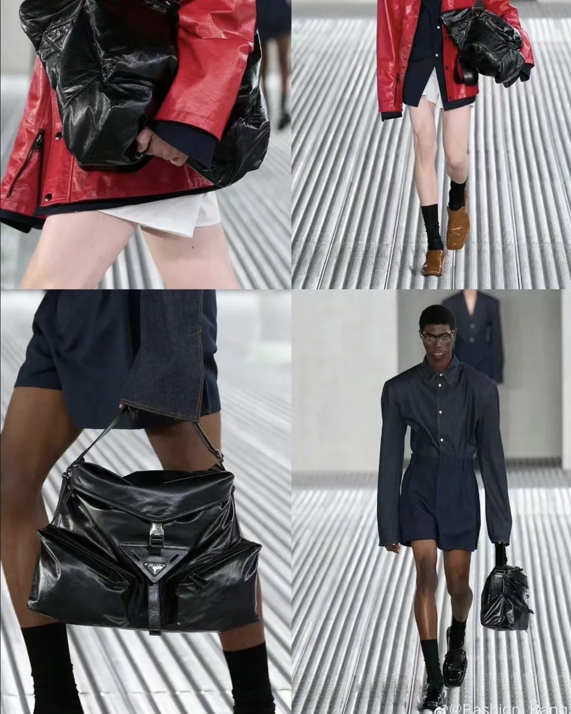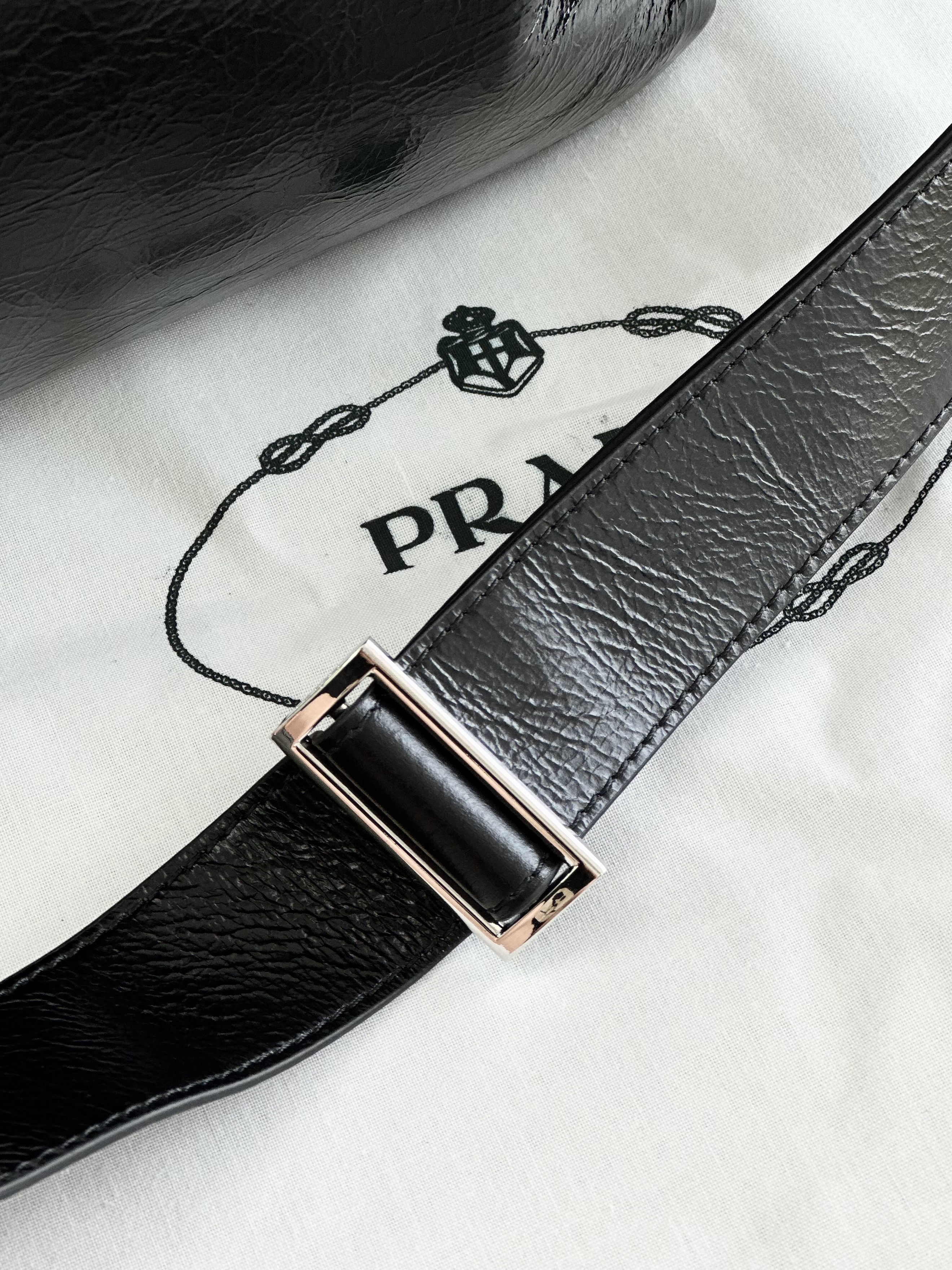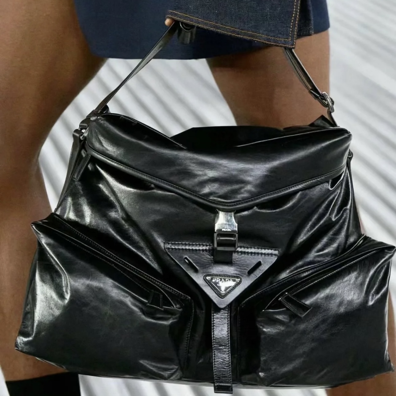 现代混搭风格设计,体现出Prada品牌的二元性内核,兼具精致美学与实用功能。容量充裕,选用质感柔软的牛皮革打造,呈现线条分明的几何造型。