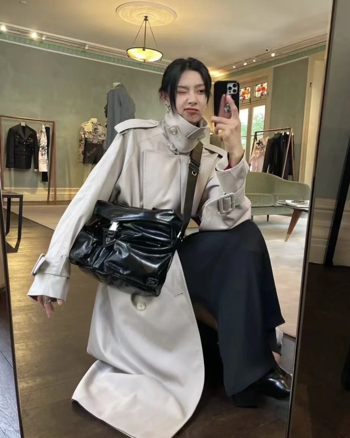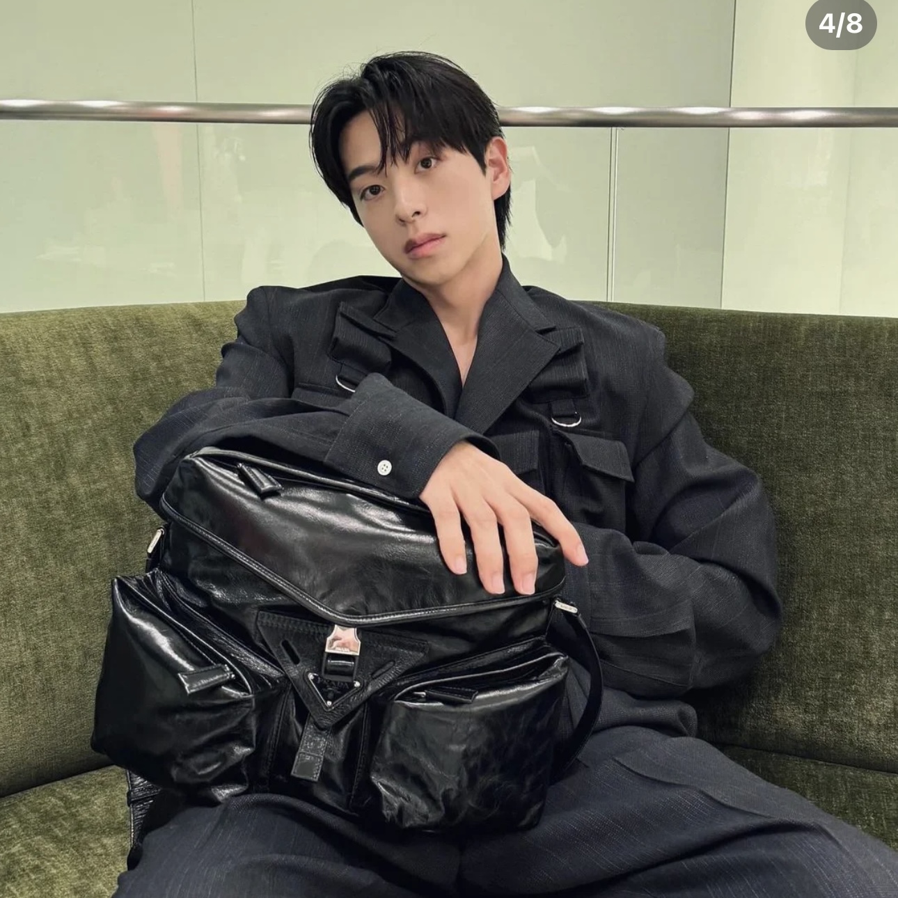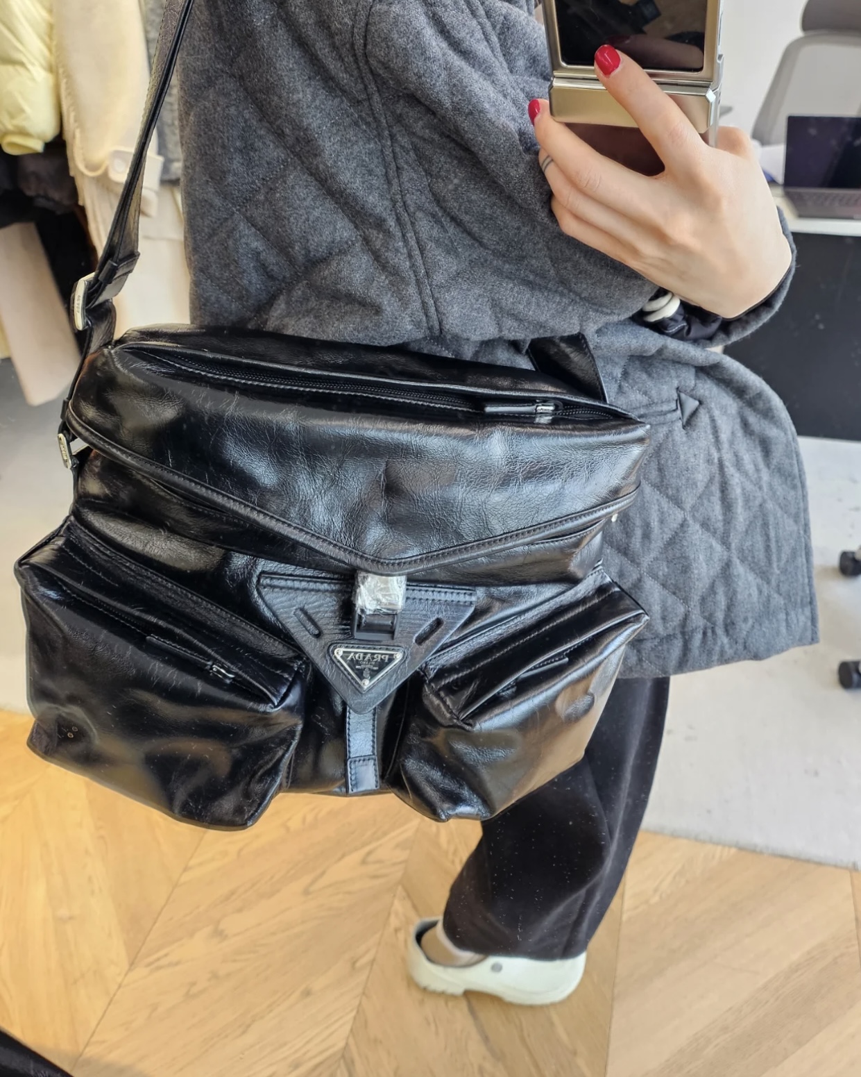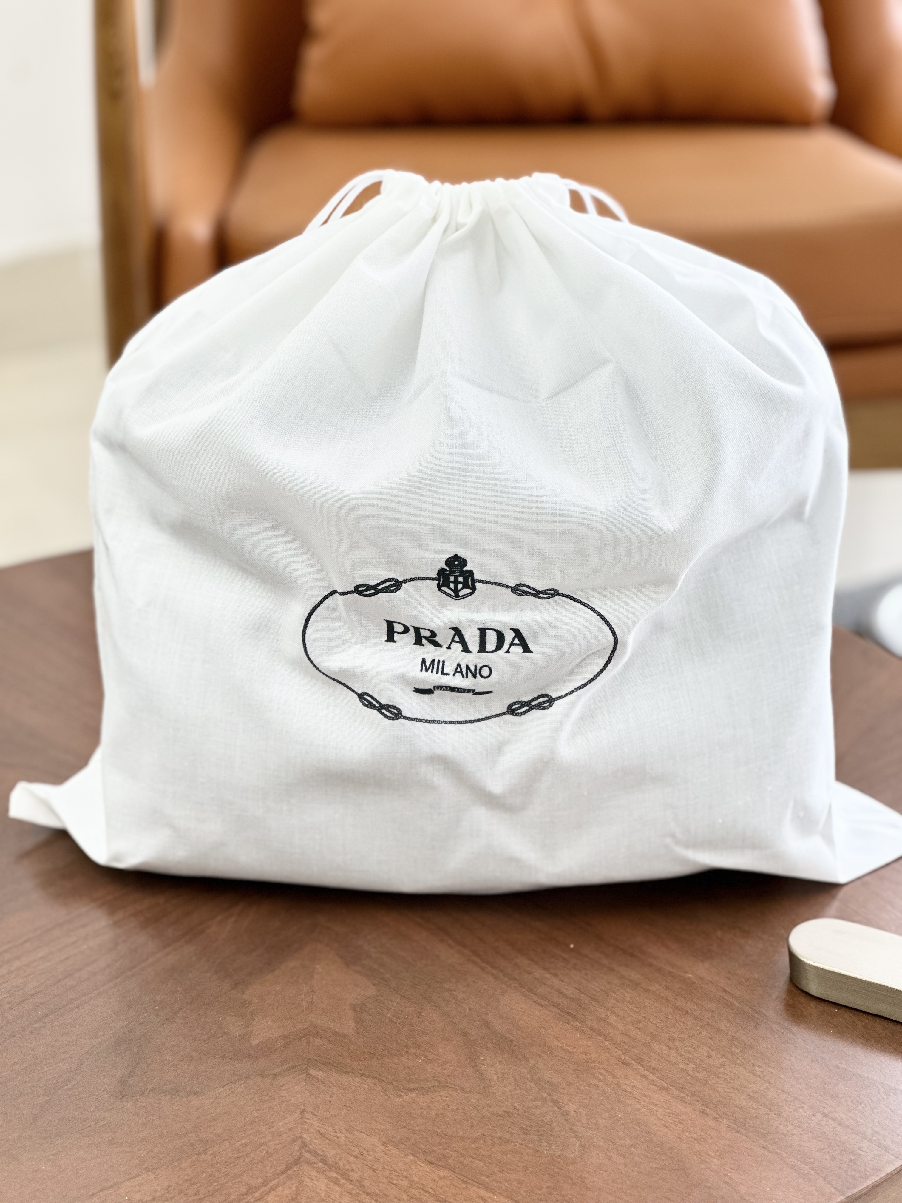 现代混搭风格设计,体现出Prada品牌的二元性内核,兼具精致美学与实用功能。容量充裕,选用质感柔软的牛皮革打造,呈现线条分明的几何造型。