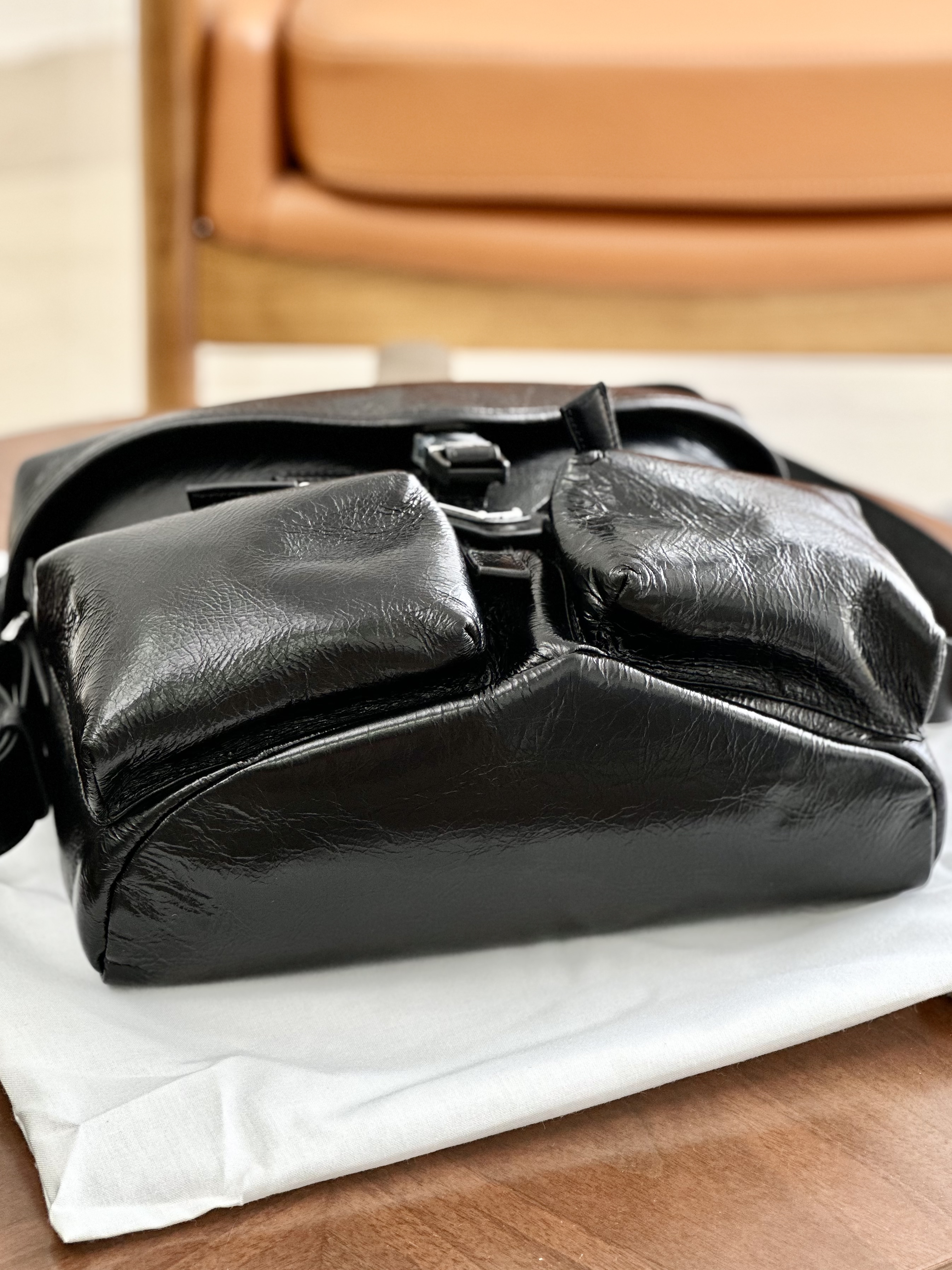 这款包采用了油蜡牛皮和进口五金,前幅插扣和翻盖外加2个口袋设计,配一条可调节肩带;