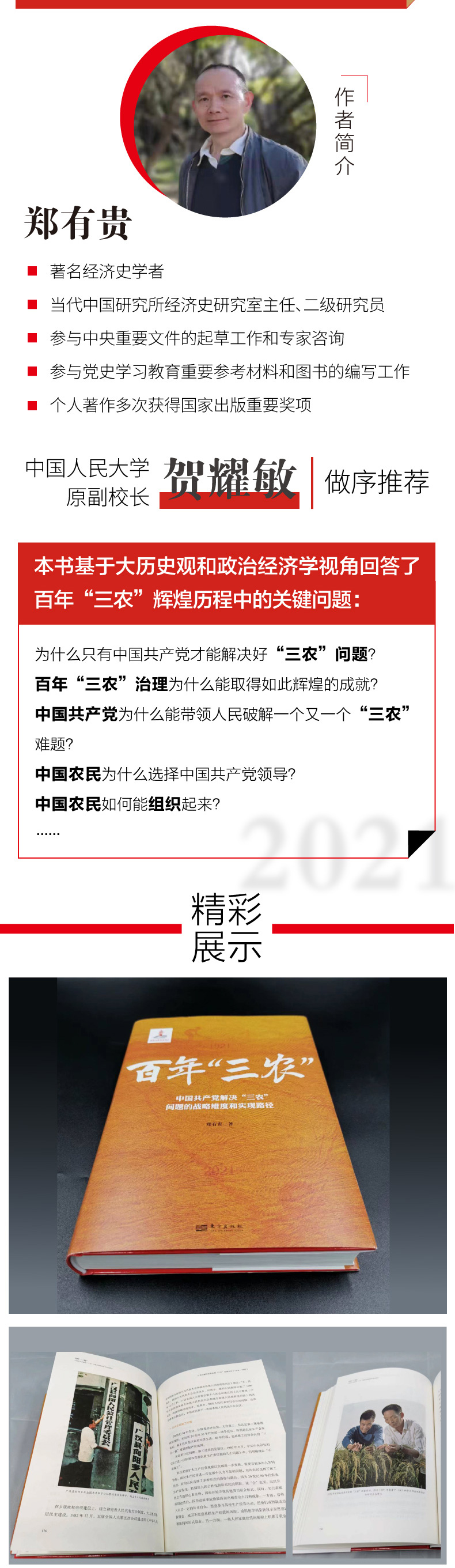 本书历史地、辩证地把握百年间的“变”与不变,有针对性地、创新性地回应学界和社会关注的重大历史事件及与之相关理论的“疑点”问题,更深刻地阐析百年“三农”历史性变革和历史性成就来之不易及其宝贵经验,使之成为深刻阐析中国共产党百年农民运动与解决“三农”问题的科学信史,力争成为标志性的精品力作、传世之作。