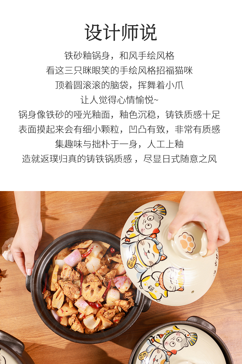 【铁砂釉三小猫】陶煲王日式和风小清新砂锅炖锅家用煲汤燃气灶专用耐高温陶瓷沙锅
