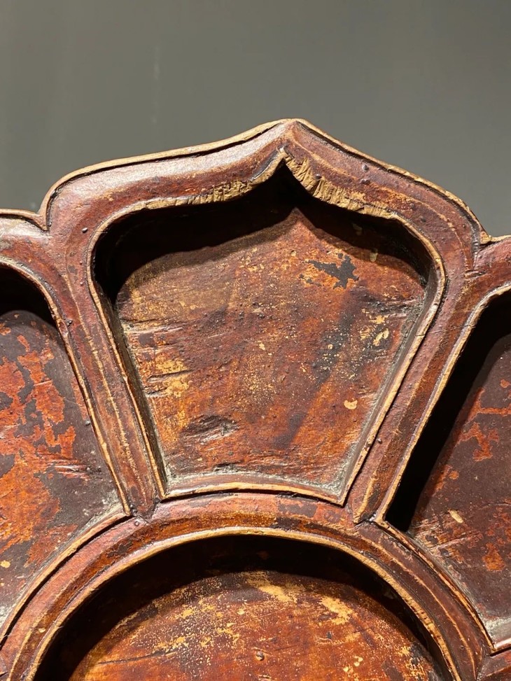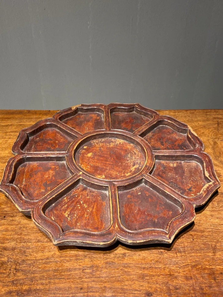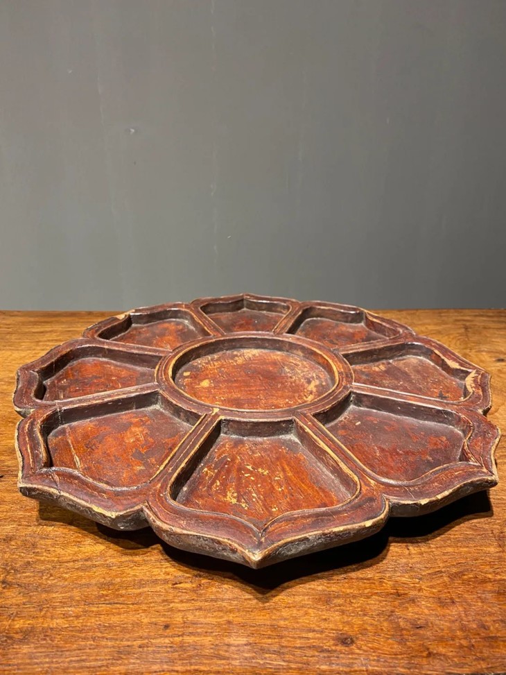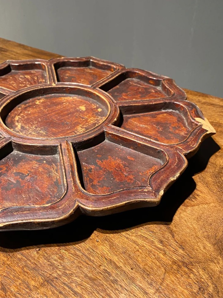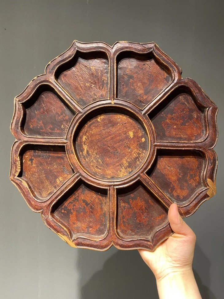 这是一只以大块榆木掏空雕琢而成的寺庙或佛堂佛供佛时用于摆放供品的大供盘,整体造型成佛家宝相八瓣莲花行,每一莲瓣与花芯挖空成摆放各种供品的承盘,宝相莲花造型典雅,雕琢细腻,尺寸硕大,直径近四十厘米,整木雕琢而成重逾一公斤,整体典雅贵气,表面保留斑驳清漆与温润的硬木皮壳,是一只清代的高雅佛前供器。