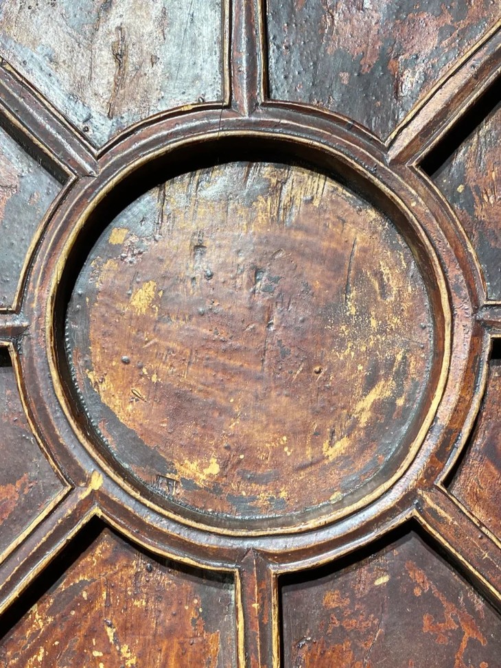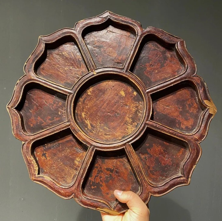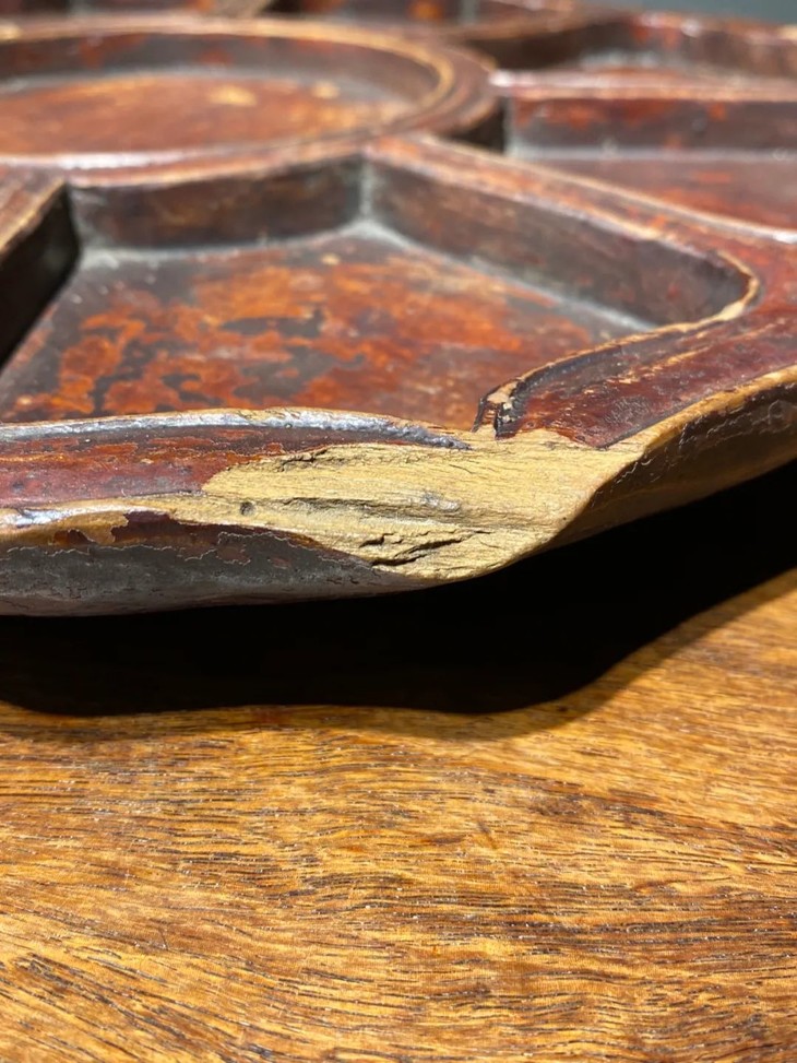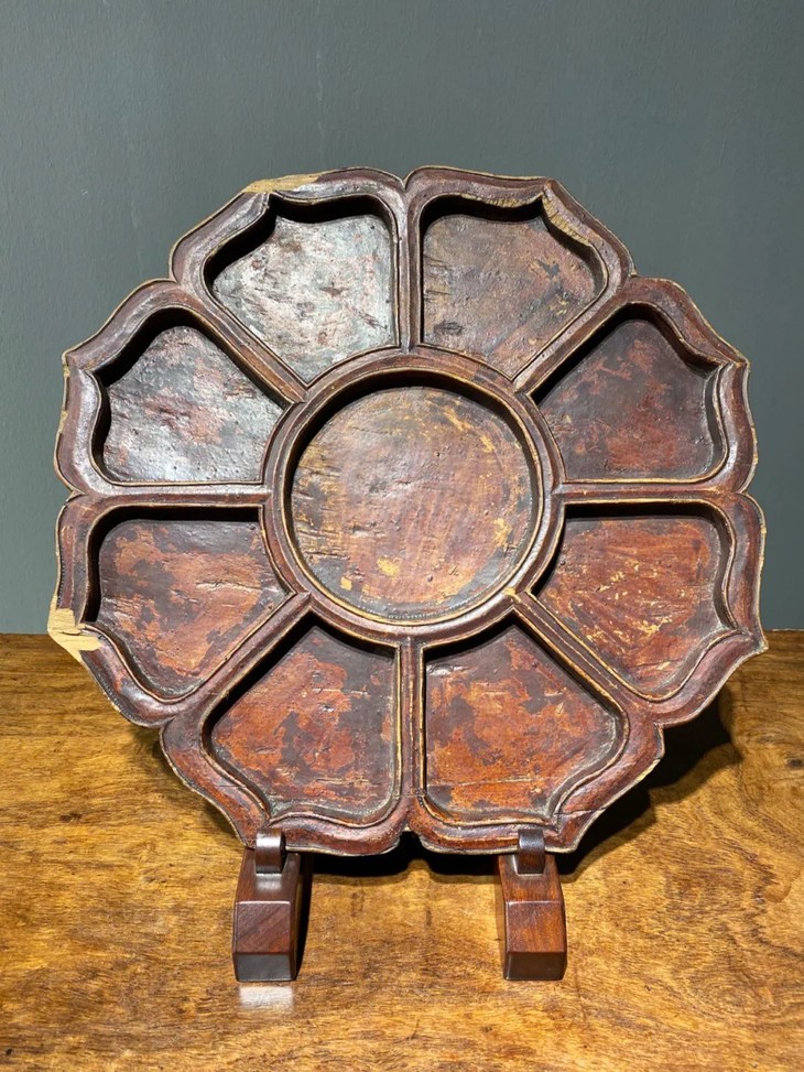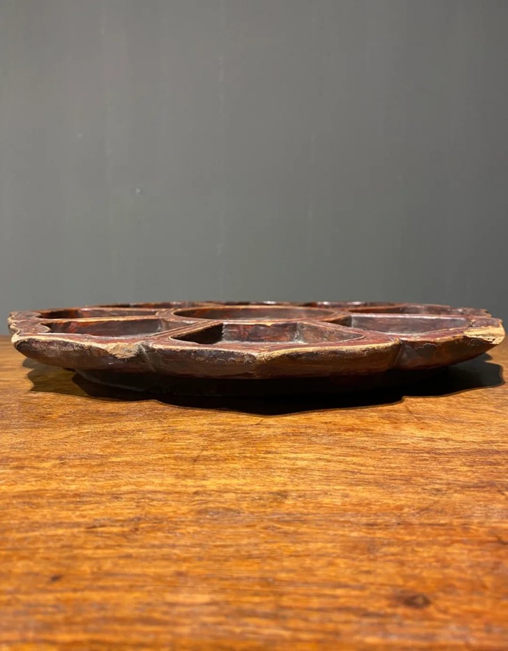 这是一只以大块榆木掏空雕琢而成的寺庙或佛堂佛供佛时用于摆放供品的大供盘,整体造型成佛家宝相八瓣莲花行,每一莲瓣与花芯挖空成摆放各种供品的承盘,宝相莲花造型典雅,雕琢细腻,尺寸硕大,直径近四十厘米,整木雕琢而成重逾一公斤,整体典雅贵气,表面保留斑驳清漆与温润的硬木皮壳,是一只清代的高雅佛前供器。
