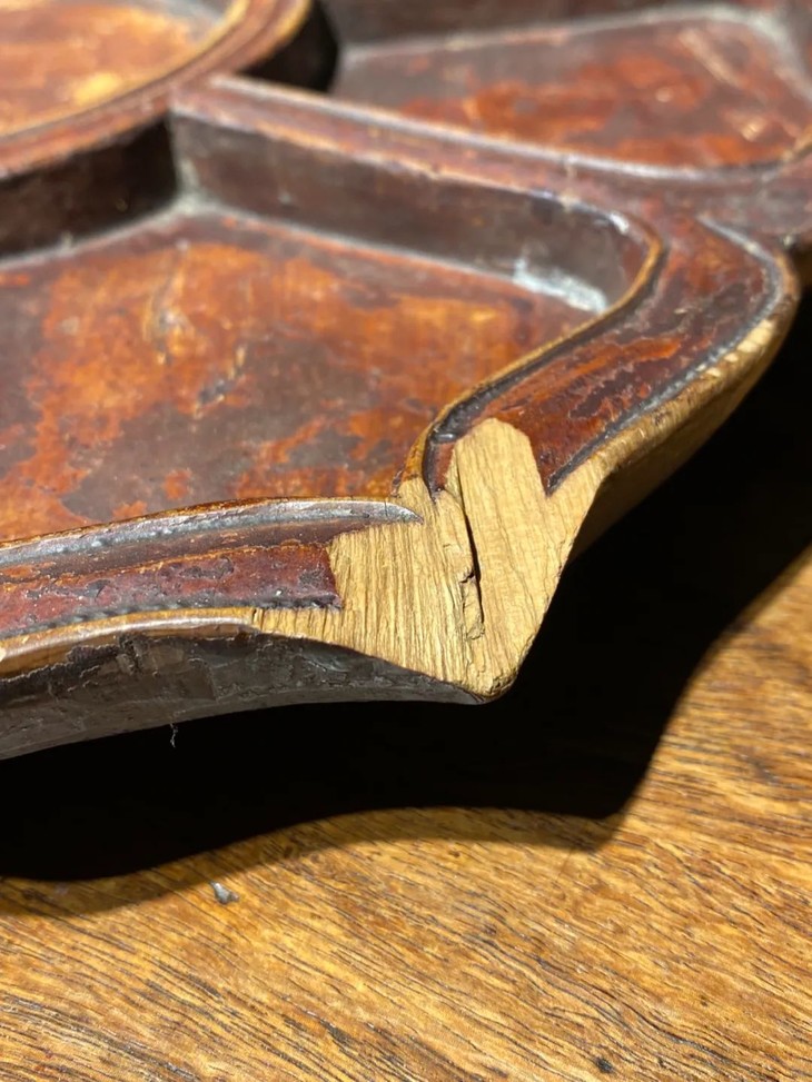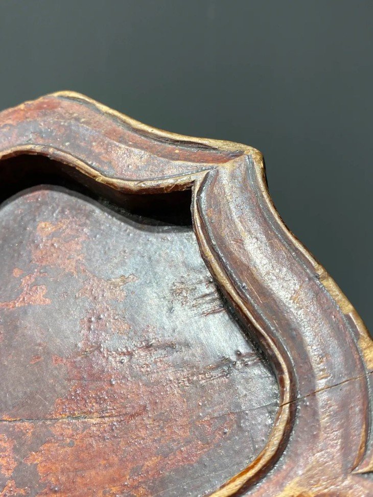 此硬木莲花形大供盘除口沿两尖角处磕碰伤(如图所示)与细微磕碰及磨损痕外,保存良好,历经百年之硬木器物,包浆皮壳温润。