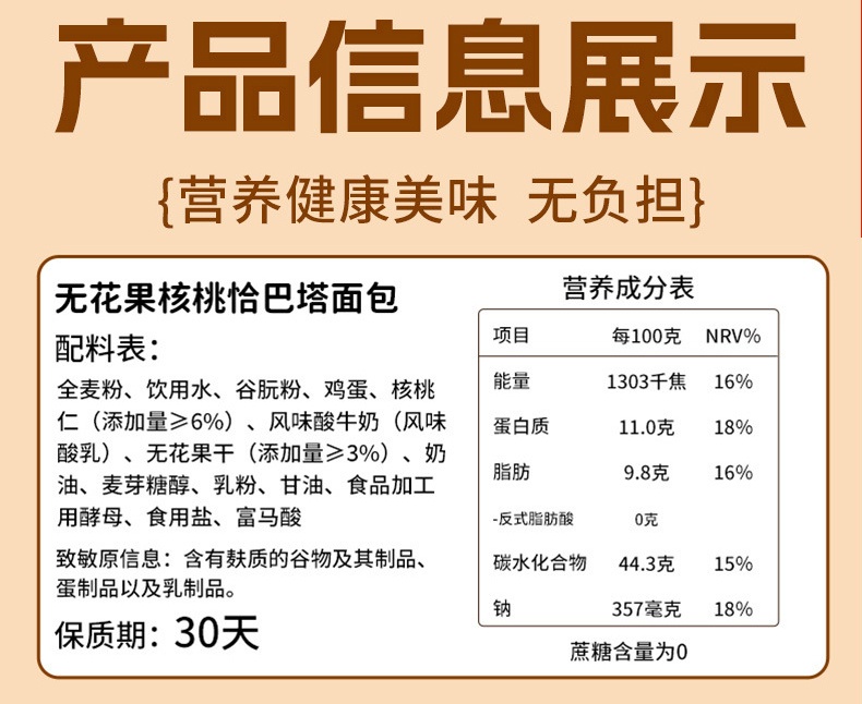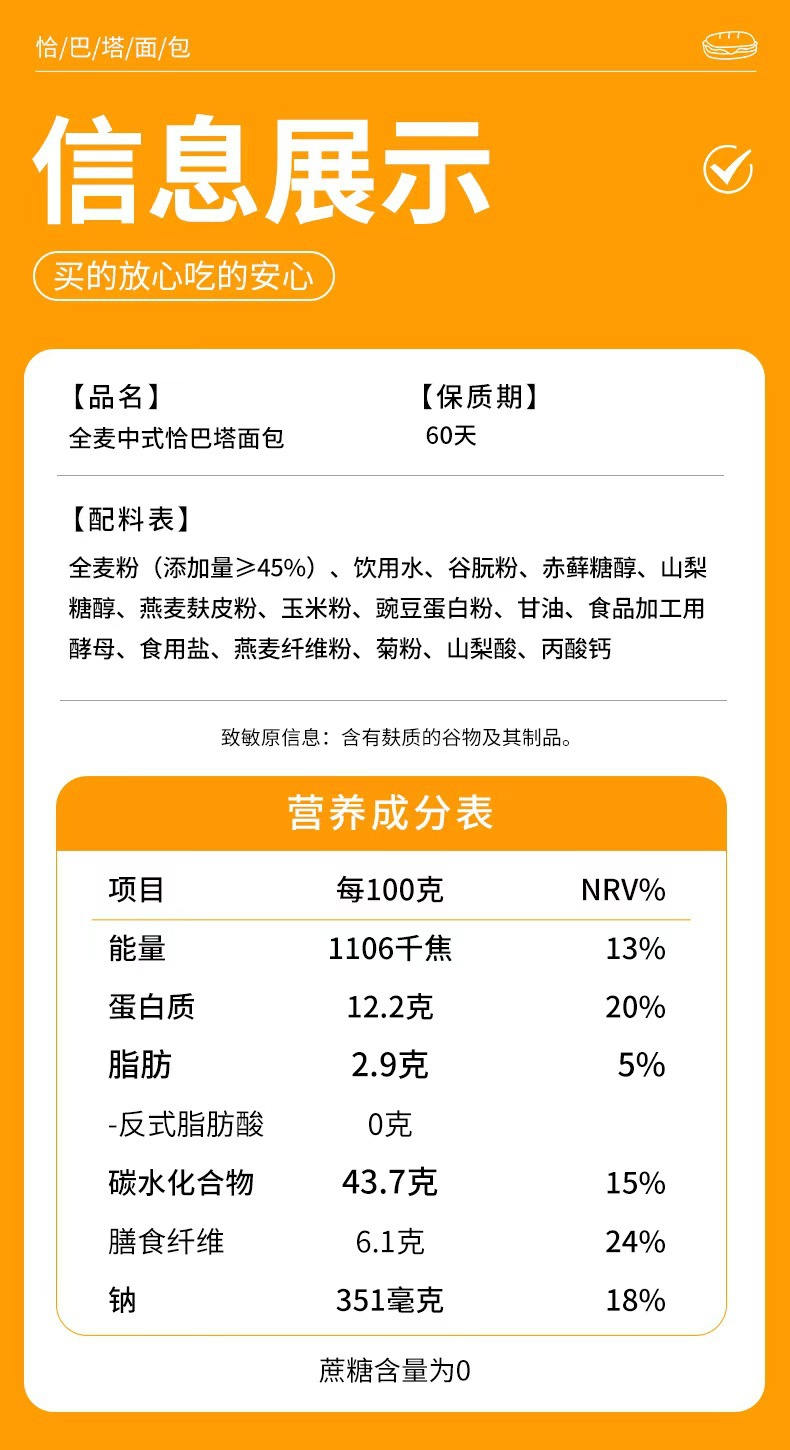 【品名】康全 无加蔗糖全麦中式/无花果核桃恰巴塔面包 麦香浓郁 【规格】 全麦中式50g/个 无花果核桃100g/个 【产地】国内 【保质期】 全麦中式50g/个:60天 无花果核桃100g/个:30天 【发货包装】独立包装 【发货地】山东 【发货快递】普通快递随机发 【不发货区域】宁夏、甘肃、内蒙古、青海、新疆、西藏、港澳台 【发货时效】48-72小时,周末节假日顺延 |