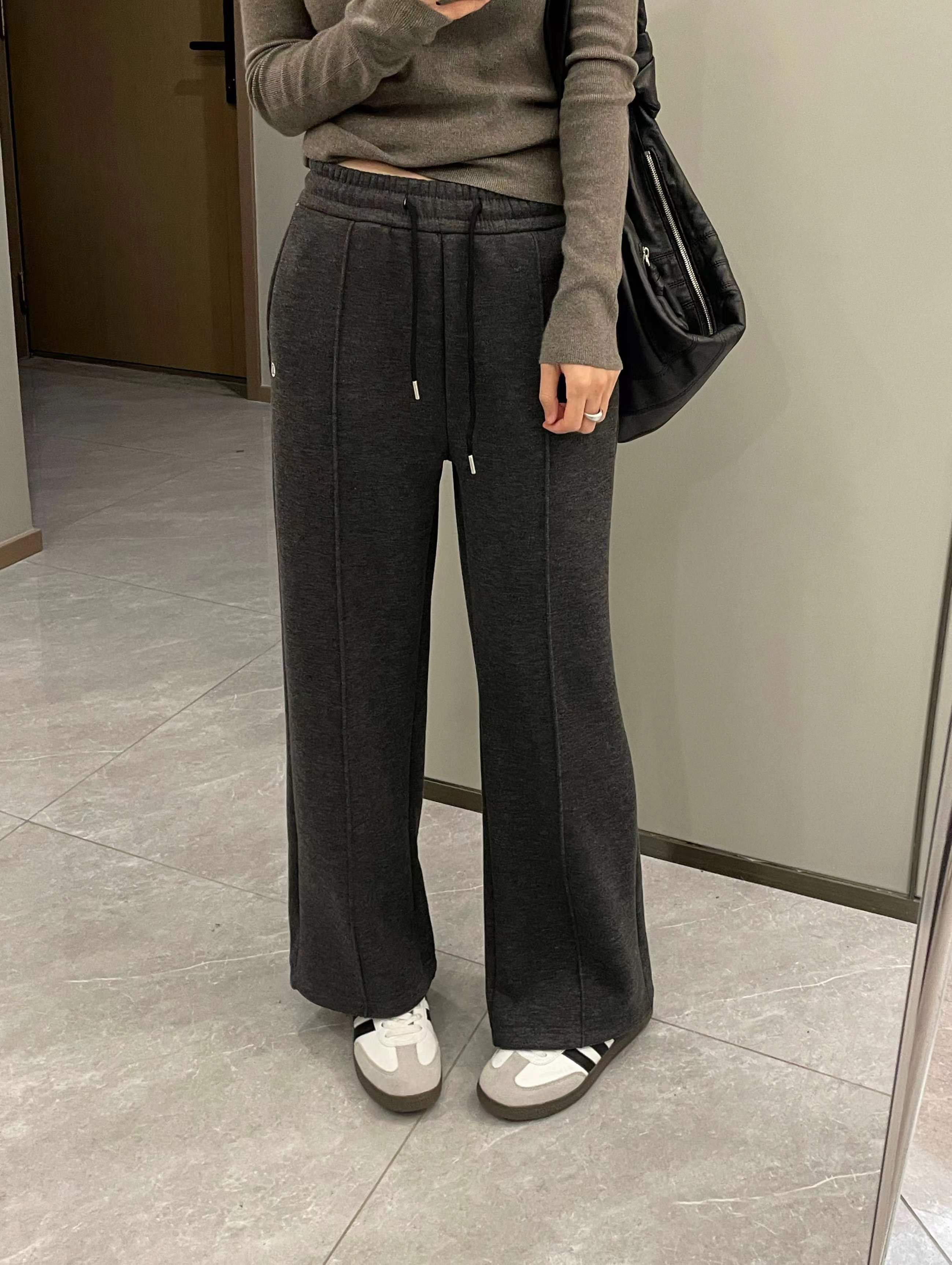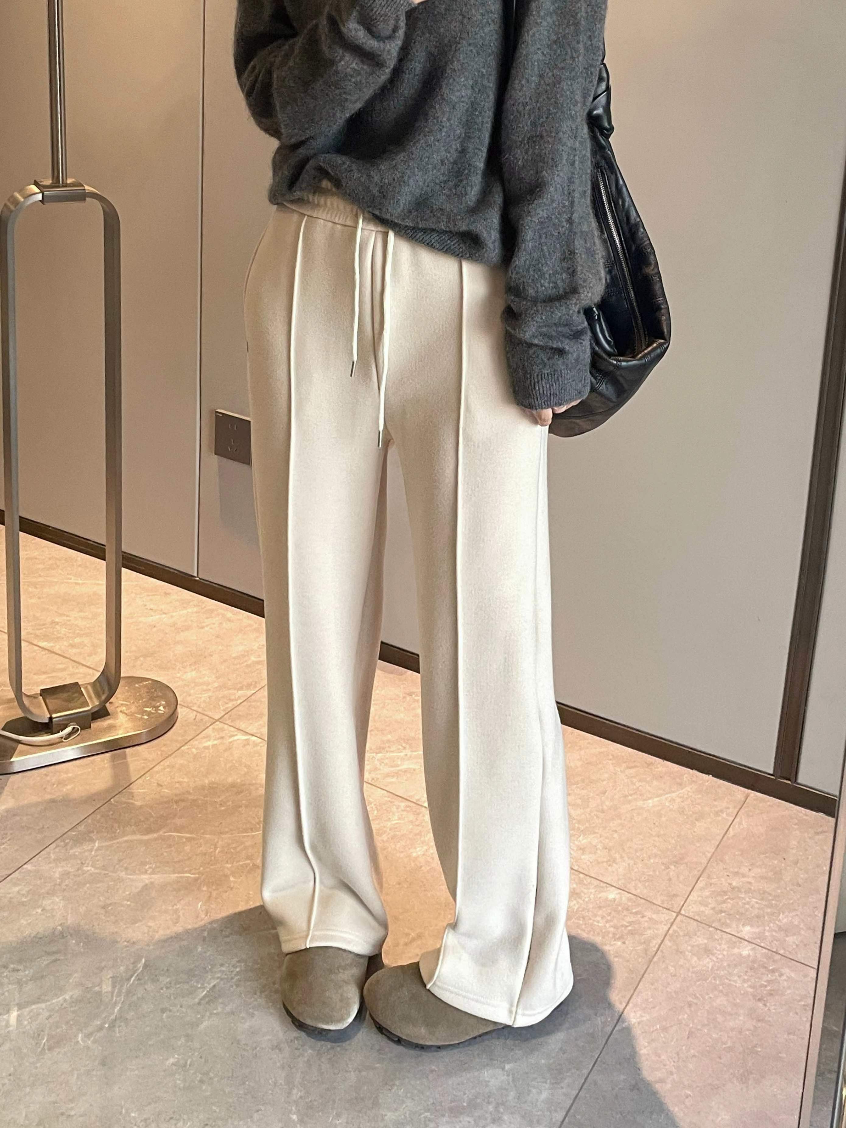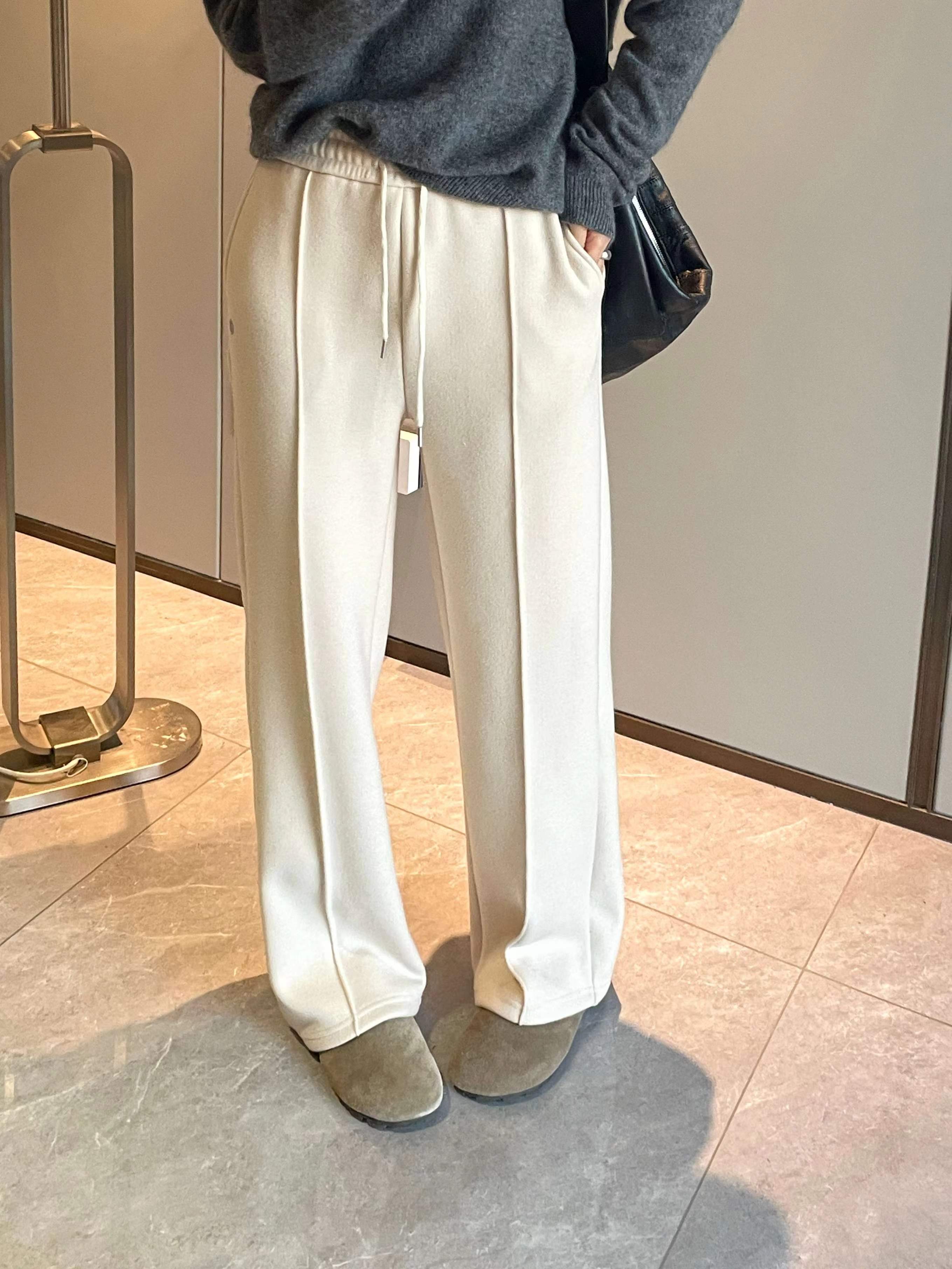 加绒中缝糯米裤面料软糯垂顺?舒适亲肤好穿面层自带细密的纹理内里超细腻蚕丝糯米绒温暖的就像被阳光拥抱日常穿着非常省心 告别频繁打理的烦恼松紧抽绳高腰??包容性很强同色系裤绳?穿搭质感直线飞升简约大气的直筒版型前片裤身立体中缝压线工艺视觉上拉长腿部比例?显高显瘦恰到好处的宽松剪裁糕级色系?干净利落百搭不被定义?自在控场上身完全没有束缚感兼顾颜值和舒适度满足全天候穿着的长期主义单品质感版型都在线!