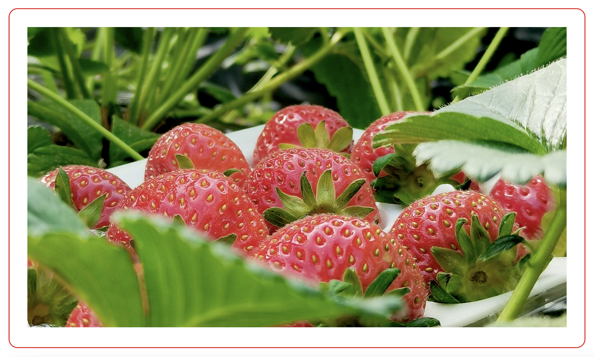 走进草莓大棚即进芳香疗愈世界,眼里尽是红红的果实在绿叶映衬下,阳光透过棚膜照在每一粒果实如红宝石般灿烂夺目!