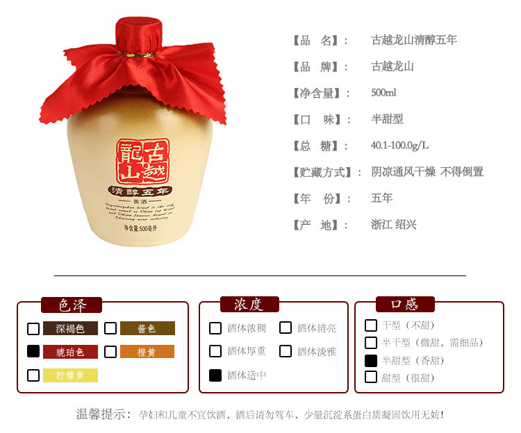古越龙山绍兴黄酒清醇五年花雕酒 500ml 10.0%vol