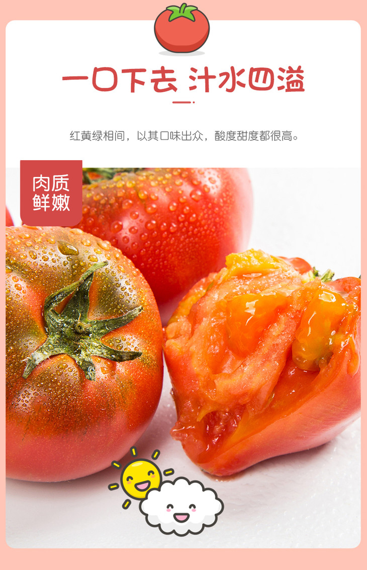 这一箱是农户在自有果园种植,依靠山泉水灌溉、施用农家肥,坚持物理防虫,不用除草剂和农药、催熟剂等,每一个草莓西红柿都是自然生长,个头大小不一,还有绿肩,看上去会觉得没熟。但一口咬下去,爽脆的外皮,满当当的汁水,入口是满口的酸酸甜甜,肉质也很紧实爽口,直接啃就行,不用去皮!