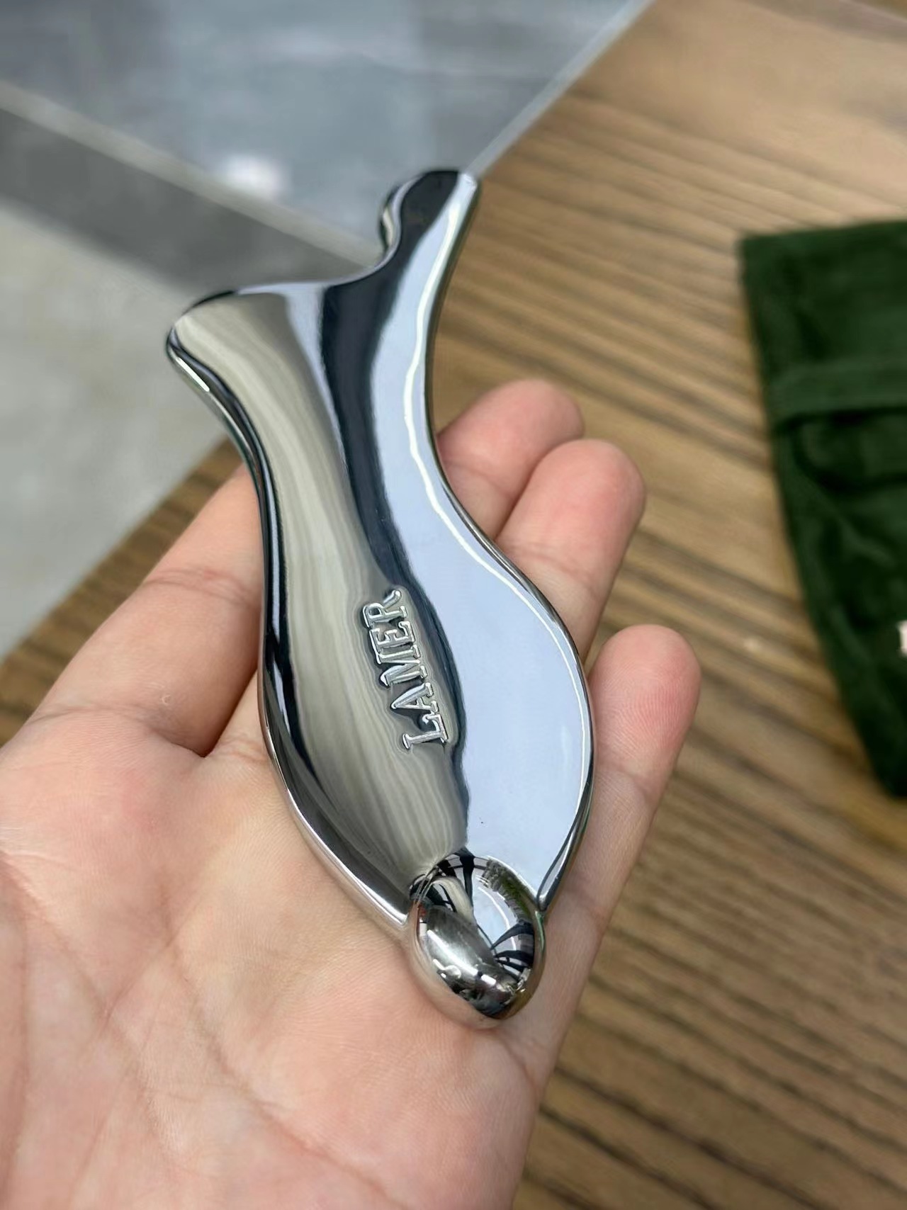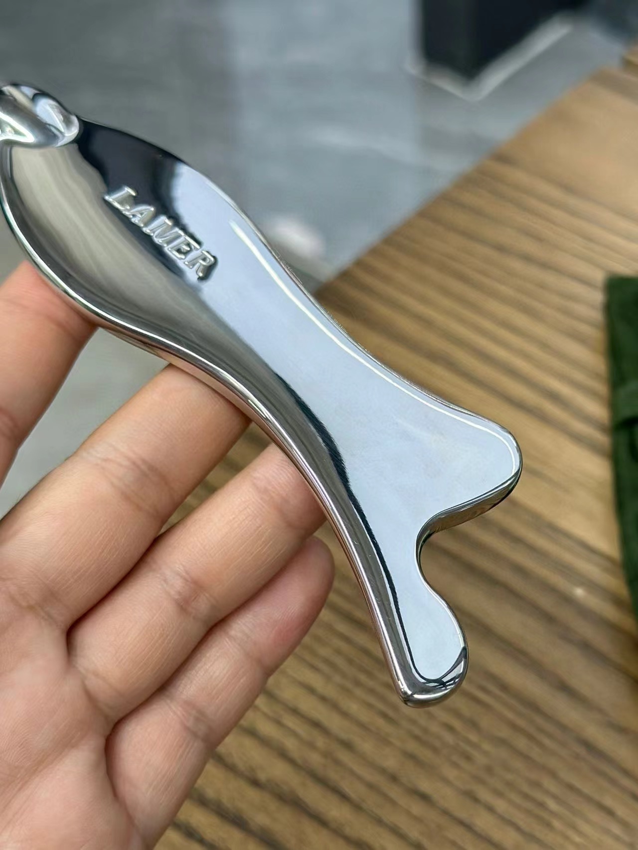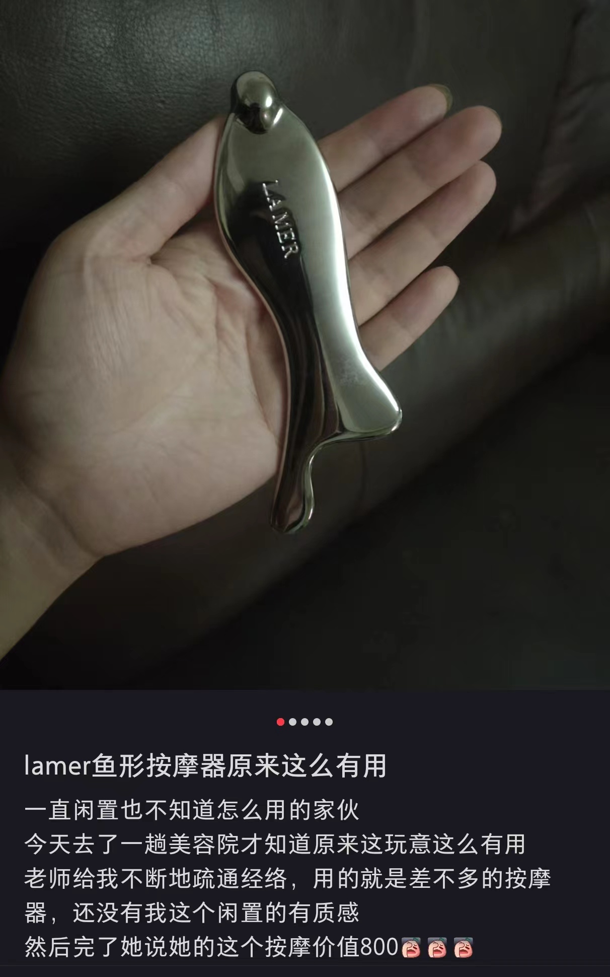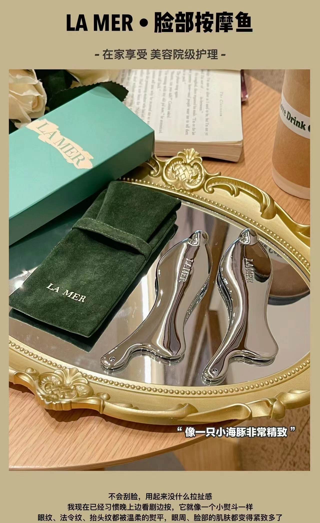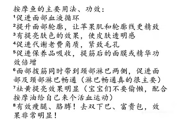 也叫按摩鱼,是一款te别实用的按摩板!它的整个设计贴合人体面部轮廓,从脸颊塑形到下巴紧致,再到眼部按摩。一步到位!再搭配精油或乳液精华,随时随地刮一刮,全身可用,时刻紧致养生排毒~