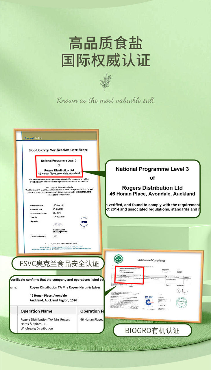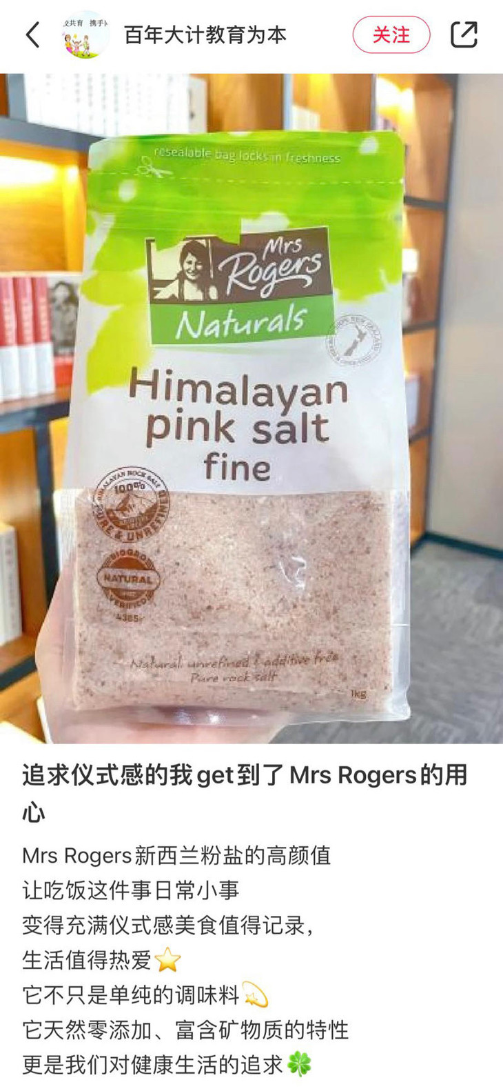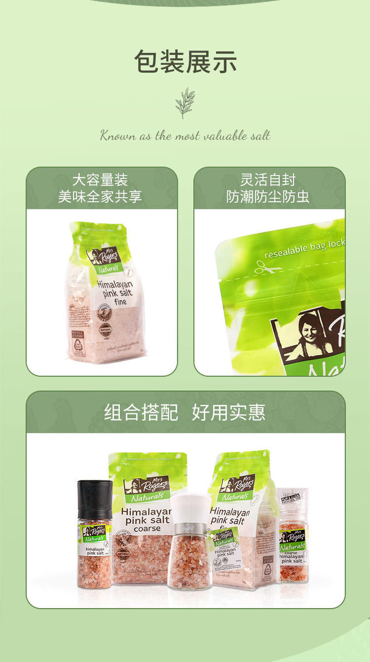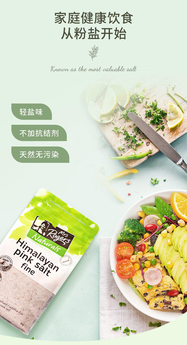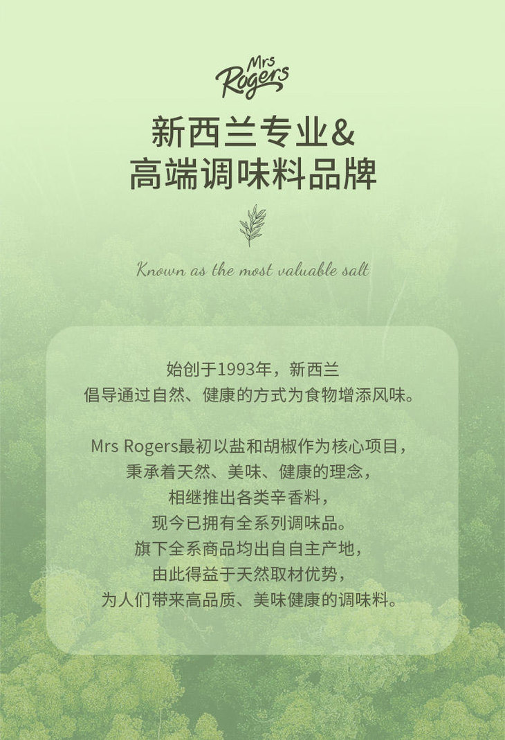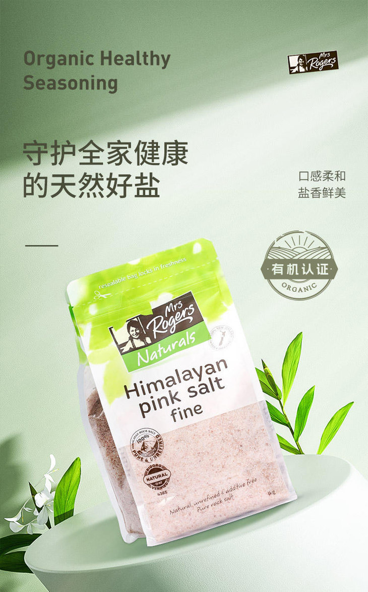 MrsRogers是新西兰蛮有名的调味料品牌,几乎每一个超市都有它的身影,非常受当地人喜爱。现在在国内也有很多明星推荐,销量也一直排在进口调味料的前列。MrsRogers粉盐富含80+种矿物质和30+种微量元素,营养价值远超普通食盐的十倍之多,食用价值高,在以前还曾是贵族的专用盐哦。