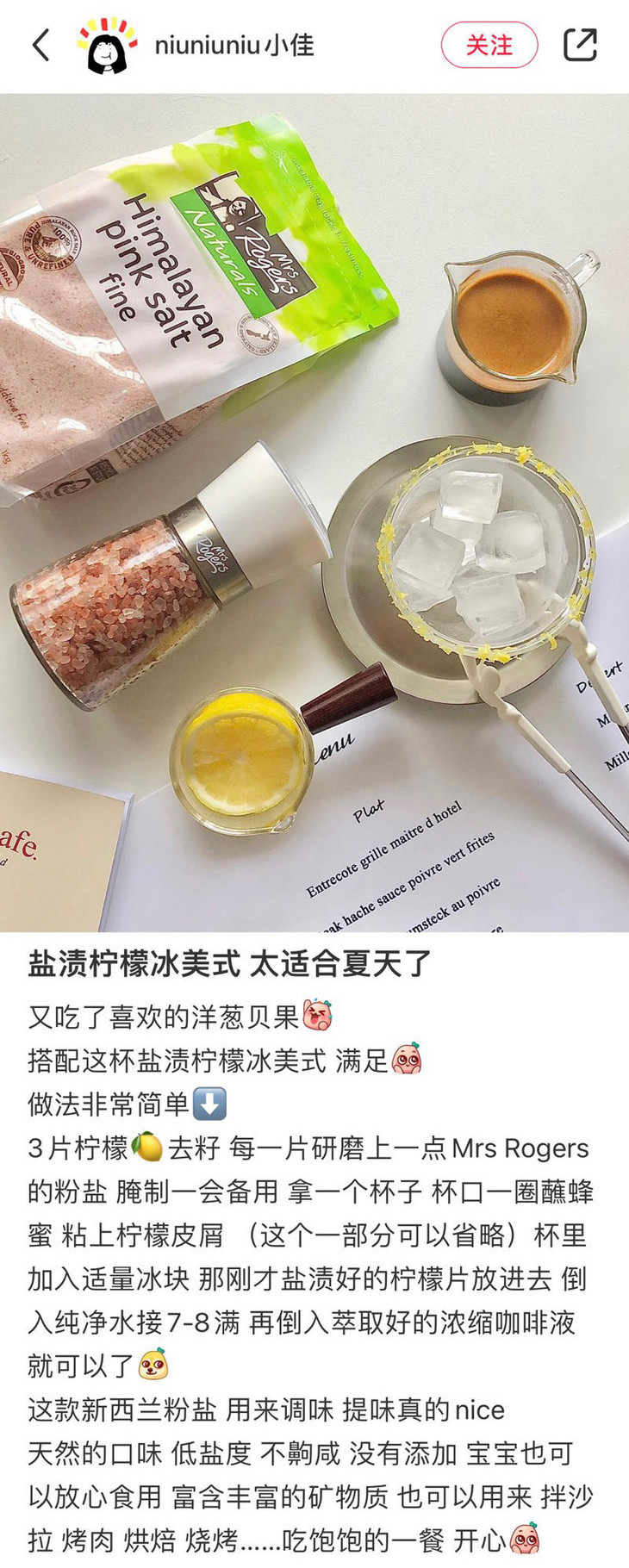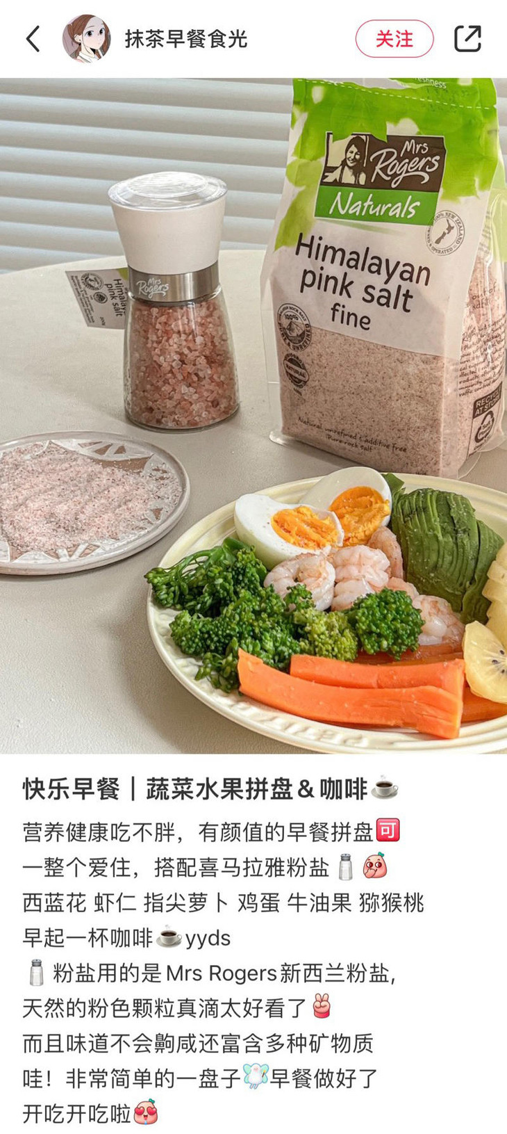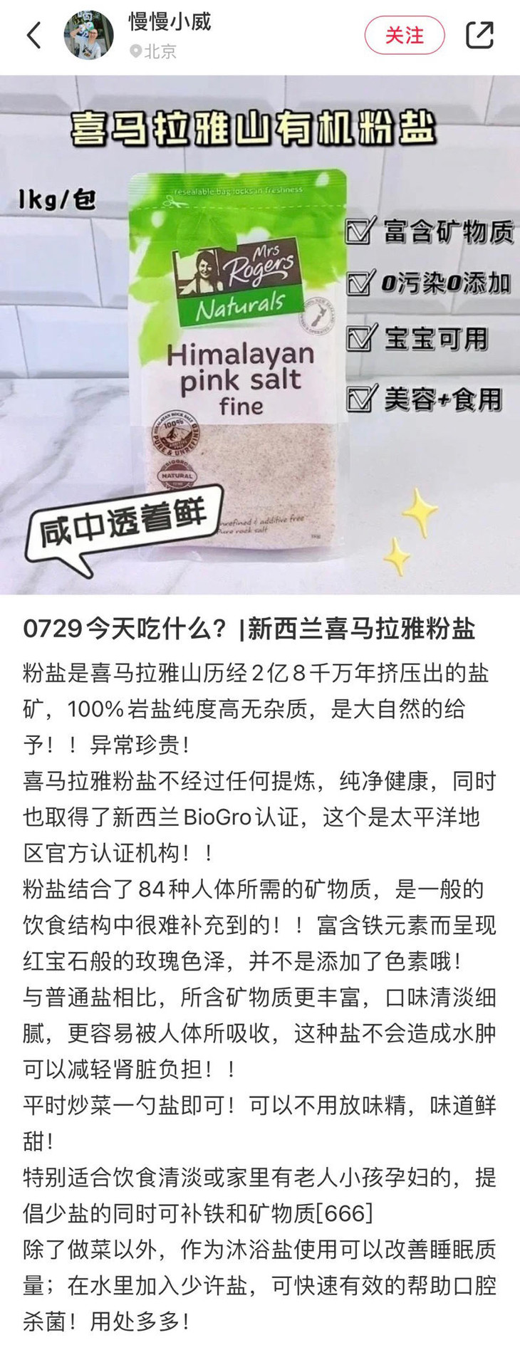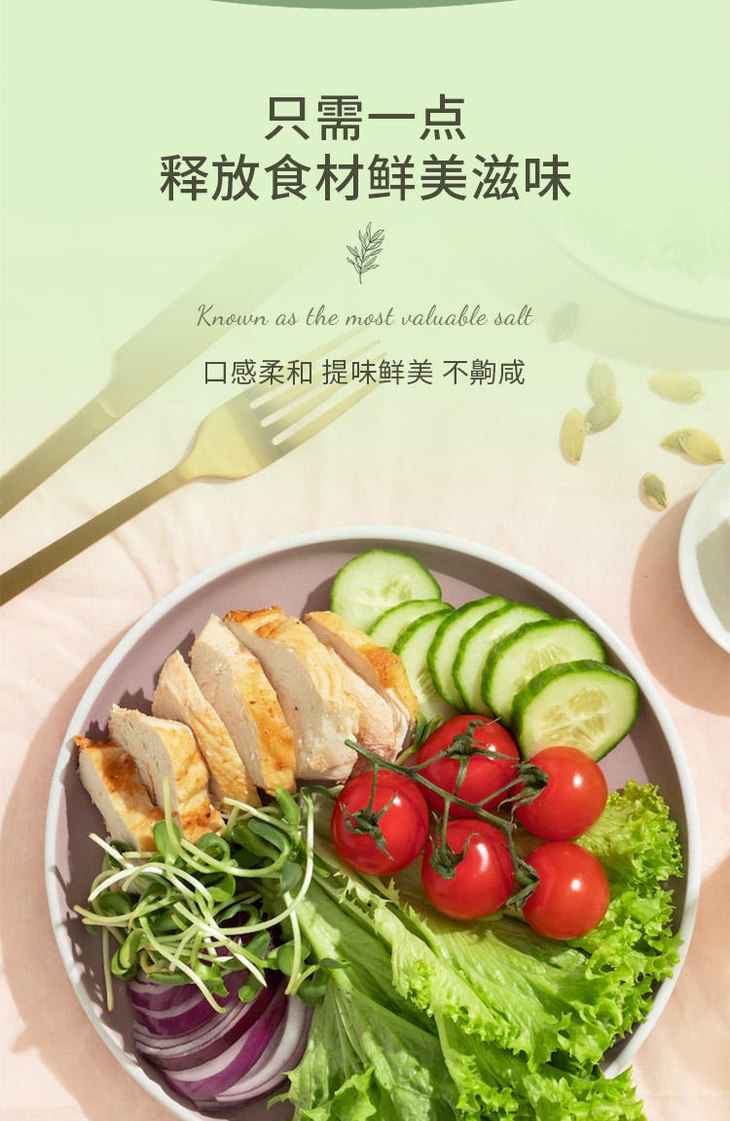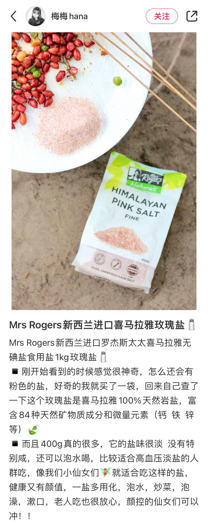 粉盐我也是被朋友种草的,刚开始就是因为觉得粉粉的好看,后来就用习惯了,特别适合撒牛排上,咸味淡一些,更能还原食物本真美味。MrsRogers粉盐其实有挺多款的,我上的是细盐,直接磨好,比较方便,基本用法跟普通食盐没有差别,一大袋有1kg,可以用好久好久!用物鸣定量调味罐装起,一罐放在厨房,一罐放在客厅,生酮时每天早上的那一杯盐水,就都是用它来泡泡!