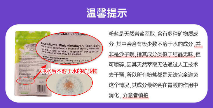盐的源地通常有:海盐、岩盐、湖盐,井盐等,从纯净程度来排序为:岩盐>湖盐>井盐&海盐,而MrsRogers粉盐便是来自喜马拉雅山脉的岩盐,是远古时代形成,深埋地下,也是非常安全和营养的矿物盐,不含抗结剂和防腐剂,对身体的负担更小,尤其是适合老人和孩子,或者是孕妇食用。