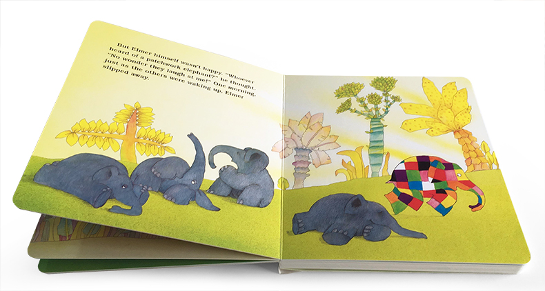 Elmer the elephant is bright-colored patchwork all over. No wonder the other elephants laugh at him!