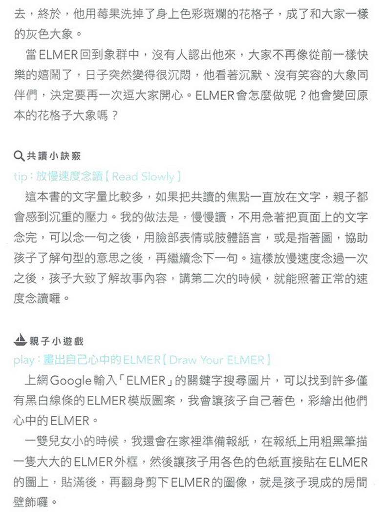 放眼望去,无论高的矮的、胖的瘦的,仅管长相不大一样,但所有的大象同伴都有相同的特征:都是灰扑扑的颜色;只有Elmer不同,拥有一身斑斓缤纷的色彩,虽然身上颜色和大家不大相同,Elmer没受到排挤,反而是团体里的开心果,仅管如此Elmer心中仍有一个打不开的结,他并不想要与众不同。因此有一天,趁天未亮,Elmer悄悄溜出来了,走进森林,走进了长满莓果的灌木丛里,用力摇下树上灰色的莓果,接着在满地的莓果上滚来滚去的,终于Elmer达成心愿成了一只灰色的大象。回到同伴的身边后,一开始Elmer还因大家都认不出他而感到沾沾自喜,但没多久,就发觉不对劲了,从前欢笑的气氛不见了,于是Elmer再度发挥逗人开心的天分……。不论身上是什么颜色,外表一点也不重要,大家开开心心生活才重要。