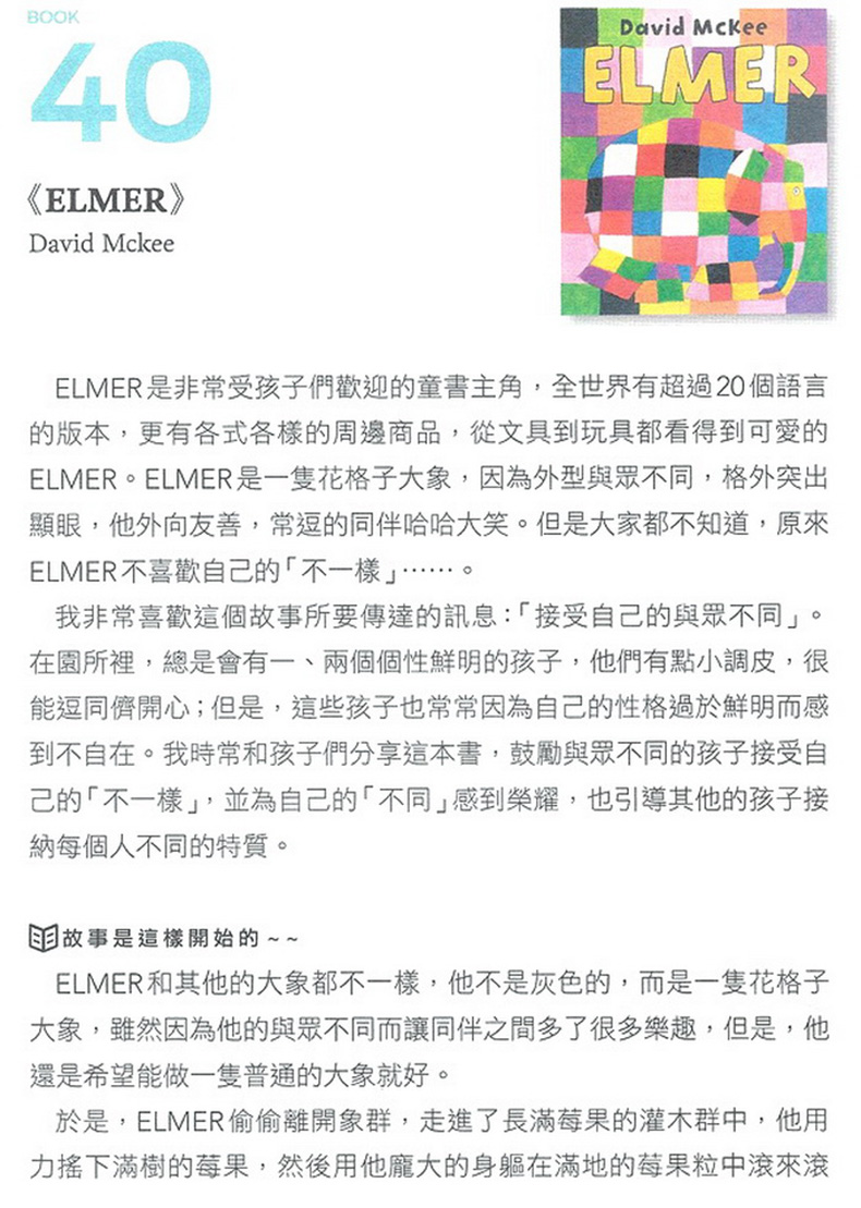 艾玛是一只花格子大象,它和其它大象住在一起。它是大象群中的开心果,艾玛走到哪里,哪里就充满着欢乐。Elmer系列书籍当中,常常会不经意之间突出一个重点——为什么我跟别人不一样、为什么我没办法跟别人一样“好”。