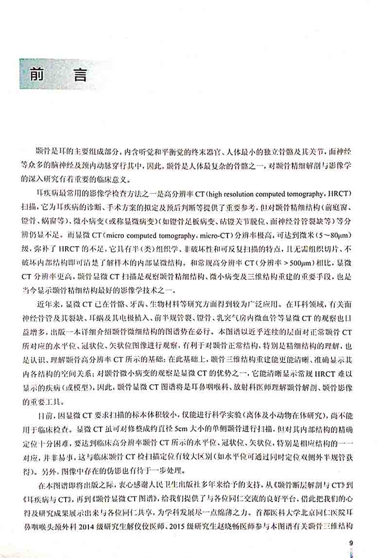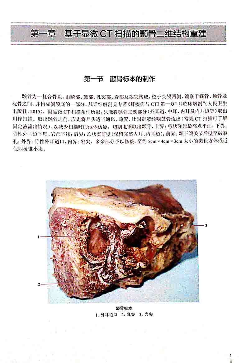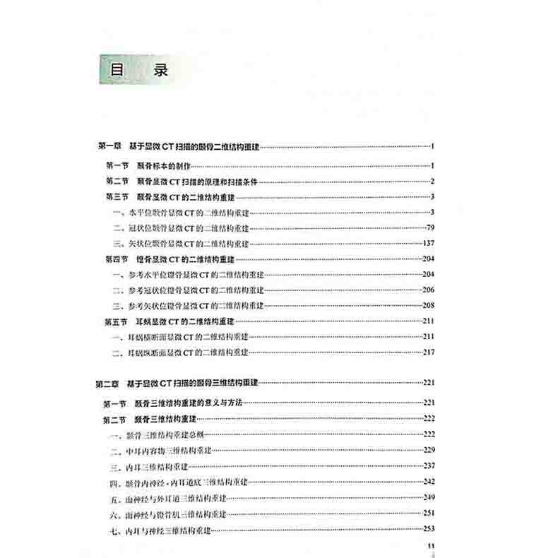 本书共分四章、约十六节,图约450幅,并附较为详细的说明,所得照片精美、结构清晰。DIYI章 分别对颞骨水平位、冠状位、矢状位(各约120幅图片)近乎连续观察,各细微结构显示清晰,是理解颞骨解剖标志及其影像学所示、相关结构测量、三维结构重建的基础。 第二章 基于Micro-CT扫描的颞骨三维结构重建,结构清晰、定位准确、空间感强 ,为临床疾病模型建立、科学研究、临床教学等提供了良好手段。第三章 对常规CT难于发现的颞骨微小病变进行观察(直径小于1mm)。先建立某些临床疾病模型,如镫骨底板穿孔、断裂、脱位,面神经骨管微小开窗、耳蜗开窗、砧镫关节脱位等,Micro-CT扫描均能清晰显示其大小、部位,为未来相关疾病的诊断、研究提供技术支持。第四章 通过对颞骨Micro-CT和常规高分辨率CT的比较,了解Micro-CT的优缺点。