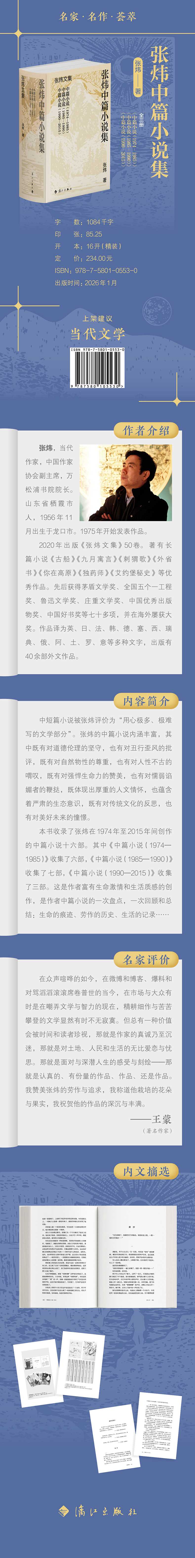 2020年出版《张炜文集》50卷。著有长篇小说《古船》《九月寓言》《刺猬歌》《外省书》《你在高原》《独药师》《艾约堡秘史》等优秀作品。先后获得茅盾文学奖、全国五个一工程奖、鲁迅文学奖、庄重文学奖、中国优秀出版物奖、中国好书奖等七十多项,并在海外屡获大奖。作品译为英、日、法、韩、德、塞、西、瑞典、俄、阿、土、罗、意等多种文字,出版有40余部外文作品。