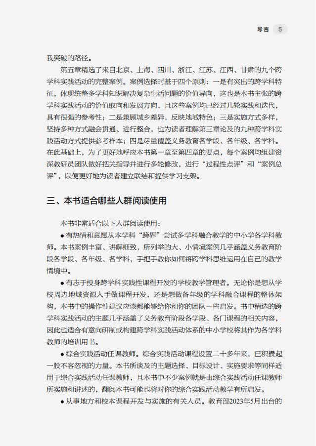 本书将各门学科课程中的;跨学科主题学习与;综合实践活动课程整合为;跨学科实践活动这样一种新型的课程形态。这一整合不仅有课程政策依据,而且有一定的学理依据和课程建设的内在需求。这是一项扎根于中国大地上的系统实践与研究成果,我推荐给大家共同批阅。
