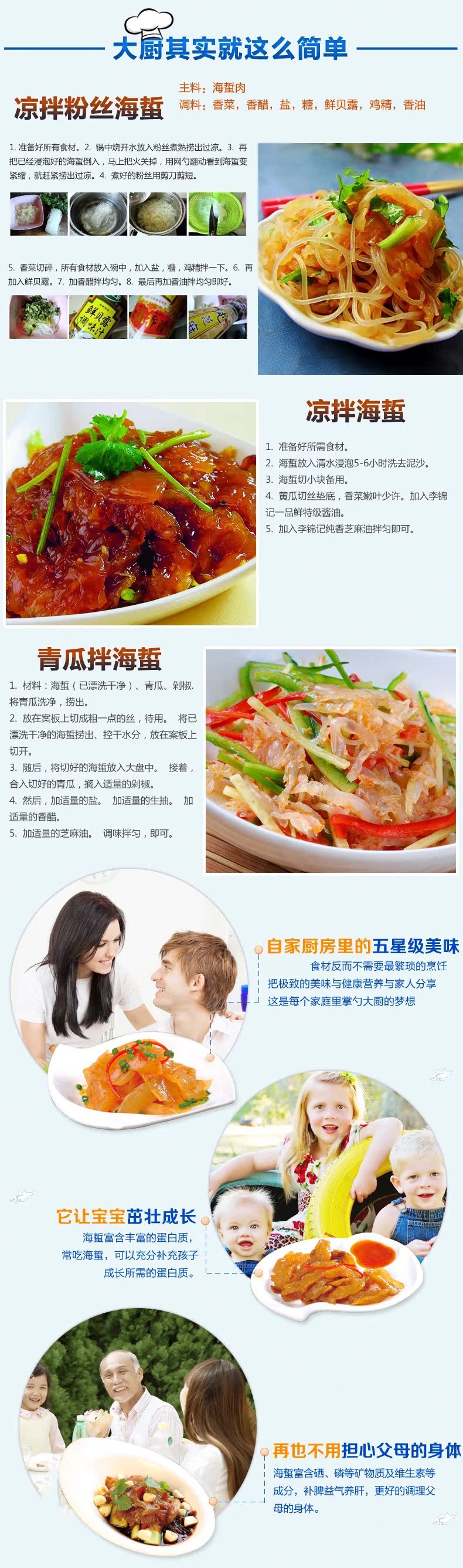 明代的《本草纲目》记载:海蜇消积、化痰、祛风、除湿,主治痞 块、头风、白带、膑膝风湿、无名肿毒。 清代的《归砚录》、《医林纂要》记载海蜇能解渴醒酒、止咳除烦、 润肠通便,对哮喘、腹痛、胀满、便秘等皆有一定疗效。 海蜇是营养极为丰富的海产佳肴,有"水产珍宝"的美誉,含有人体 必需的氨基酸多达20种,低脂肪、低热量,含有类似乙酰胆碱物质,能扩 张血管、降低血压,含有甘露多糖胶质对防冶动脉粥样硬化有一定功效, 海蜇的钾、钙、镁、铁、磷含量较高,长期使用能促进人体PH值保持健康 的碱性状态,对预防糖尿病、痛风、高血压、癌症、心脏病等极有帮助, 是不可多得的天然健康食品。