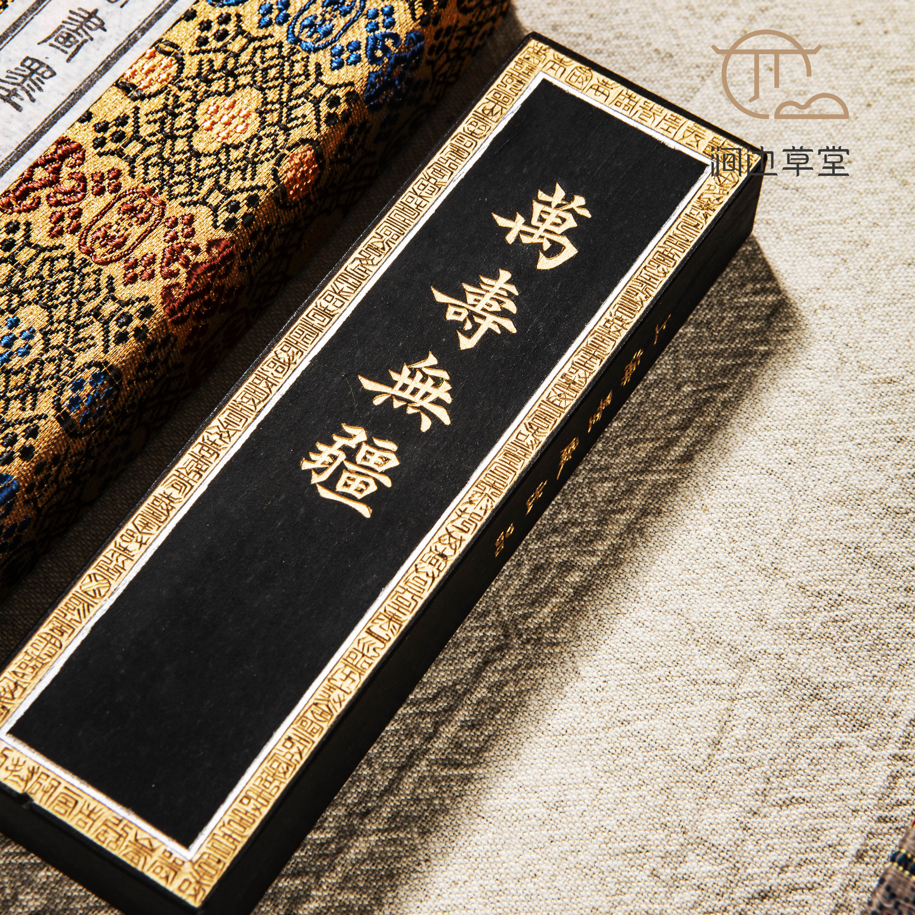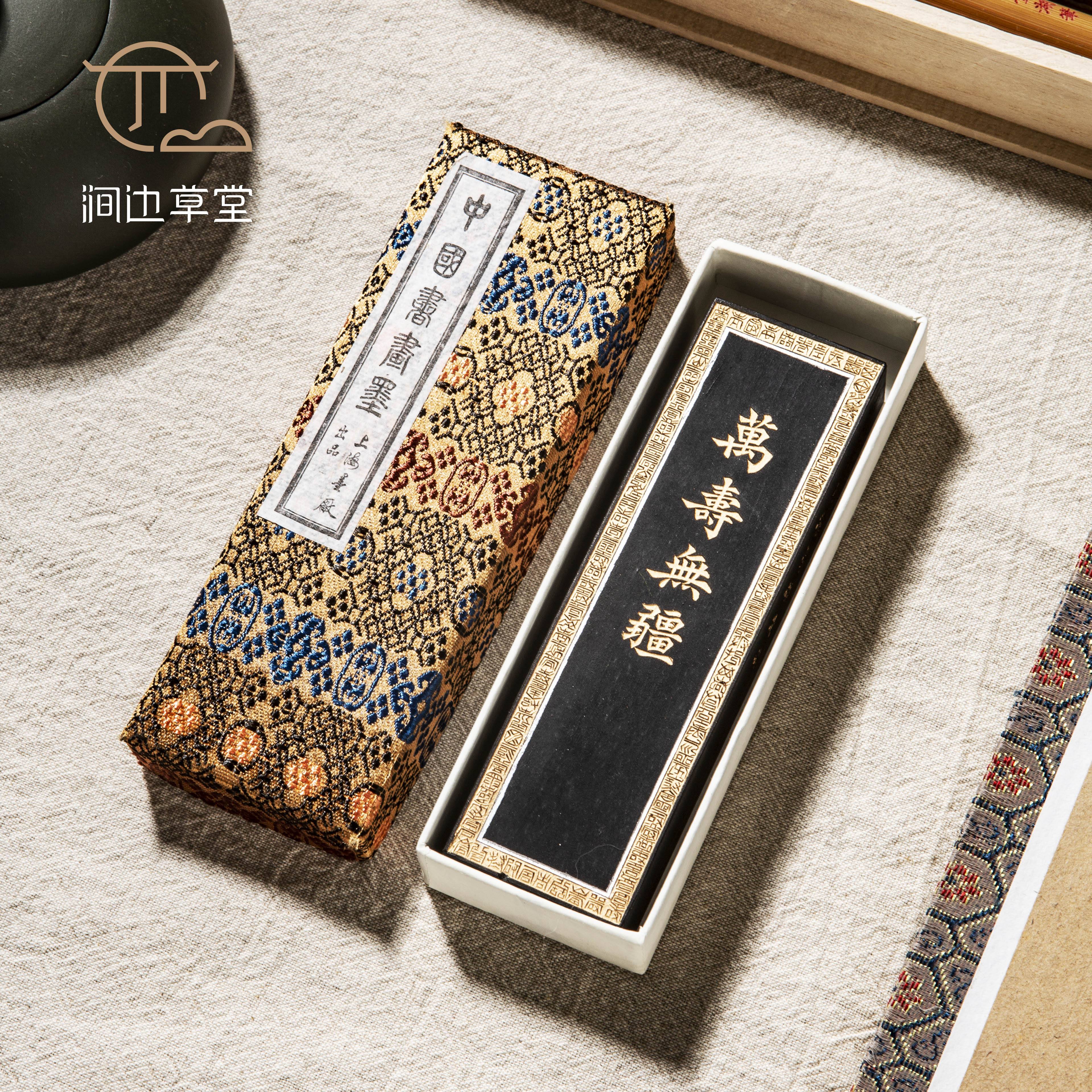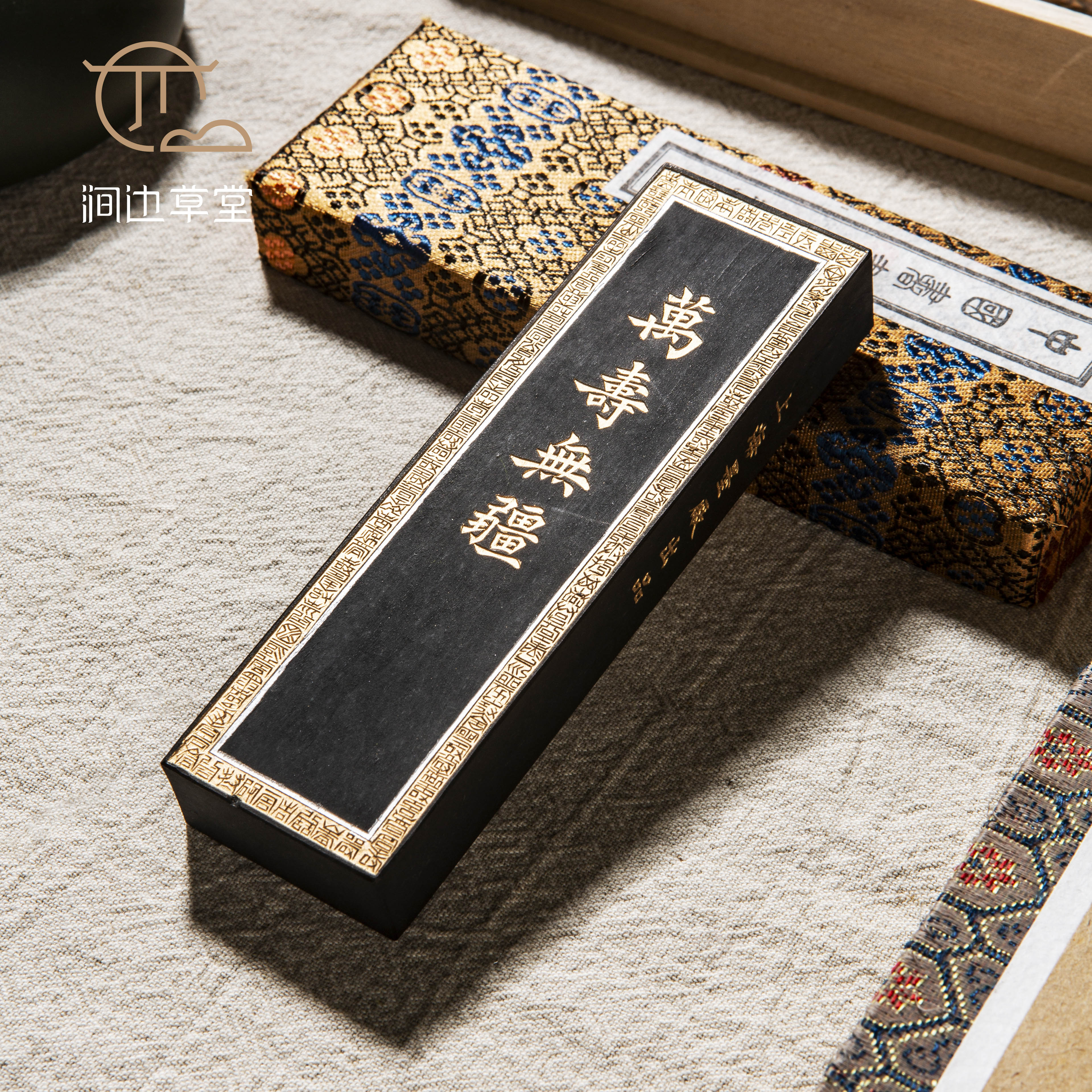 80年代上海墨厂曹素功制万寿无疆油烟老墨,原材料当年选用优质油烟,材质细腻,墨色油亮,老墨经历时间的积淀使得墨色更加稳固,胶性更轻不滞笔,宜书宜画,此墨雕版精细,外观精美,寓意吉祥,存世稀少,实用和收藏俱佳。