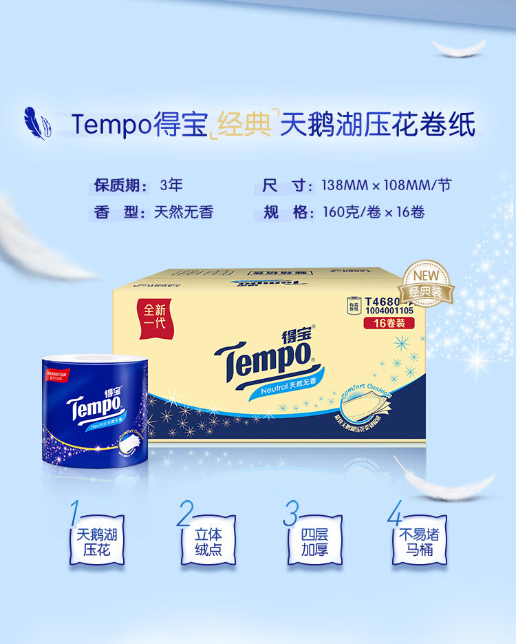 【积分兑换】得宝(Tempo)有芯卷纸4层160g*16卷筒纸 (T4680-A)