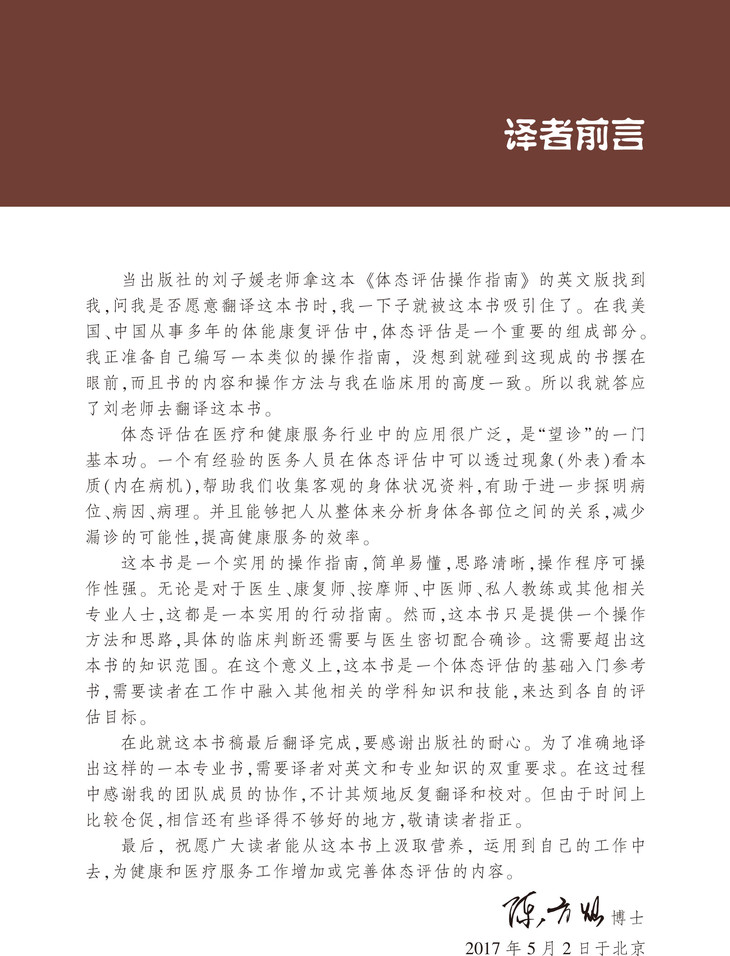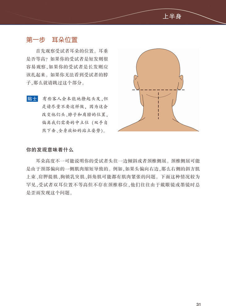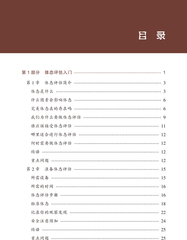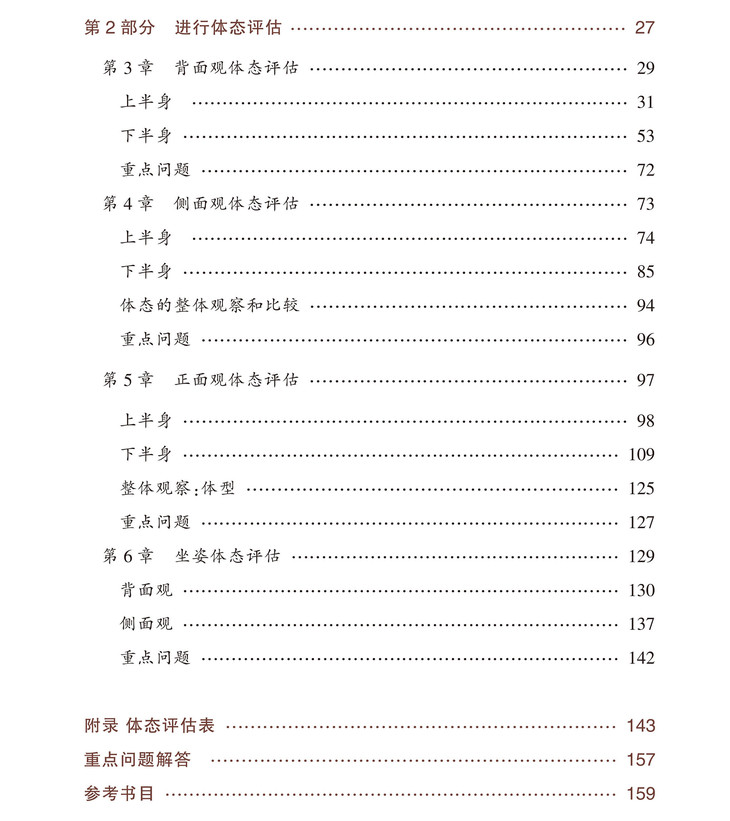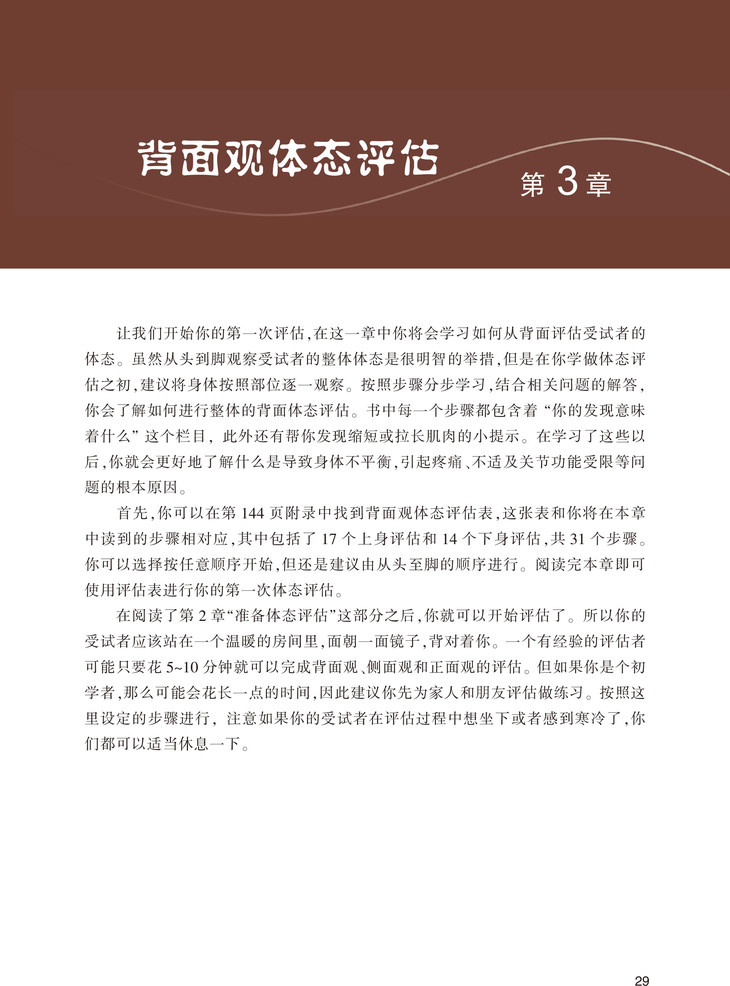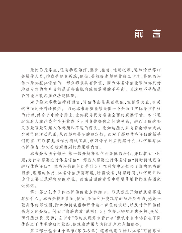 《体态评估操作指南》,为新手体态评估者如何开展体态评估所需的指导性知识,包括了解影响体态的因素、为体态评估做准备、体态评估表、分析评估结果等,通过观察人在站姿和坐姿状态下的背面观、侧面观、正面观,展示不同身体部位的关系,以此分析体态不平衡及其引起人体疼痛和不适的现象。
