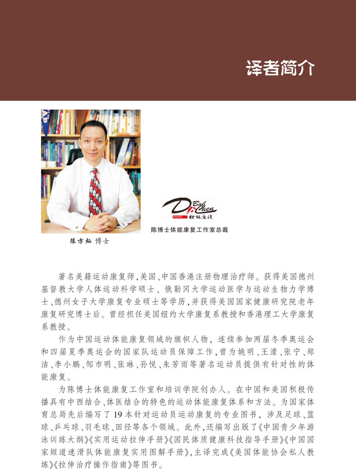 陈方灿 著名美籍运动康复师,美国和香港注册物理治疗师,美国德州基督教大学人体运动科学硕士、俄罗岗州大学运动医学与运动生物力学博士、德州女子大学康复硕士、以及美国国家健康研究院博士后。曾在美国纽约大学,香港理工大学,和首都体育学院担任教授职务。现是陈博士体能康复工作室和培训学院创办人。在美国和中国积极传播具有中西结合、体医结合的特色的运动体能康复体系和方法。
