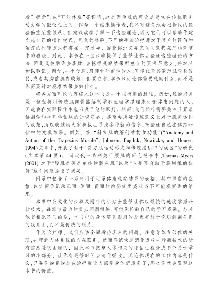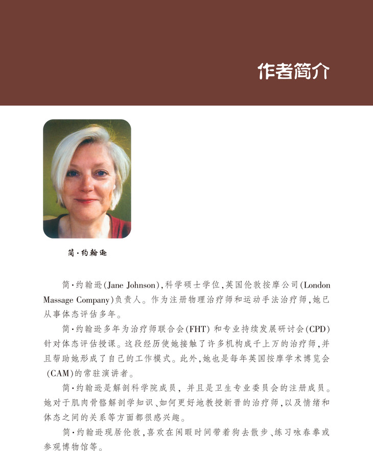 简.约翰逊(Jane Johnson) 科学硕士学位,注册物理治疗师和运动手法治疗师,英国伦敦按摩公司(London Massage Company)负责人。多年为治疗师联合会(FHT)和专业持续发展研讨会(CPD)针对体态评估授课,每年英国按摩学术博览会(CAM)的常驻演讲者。