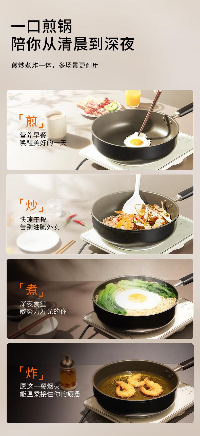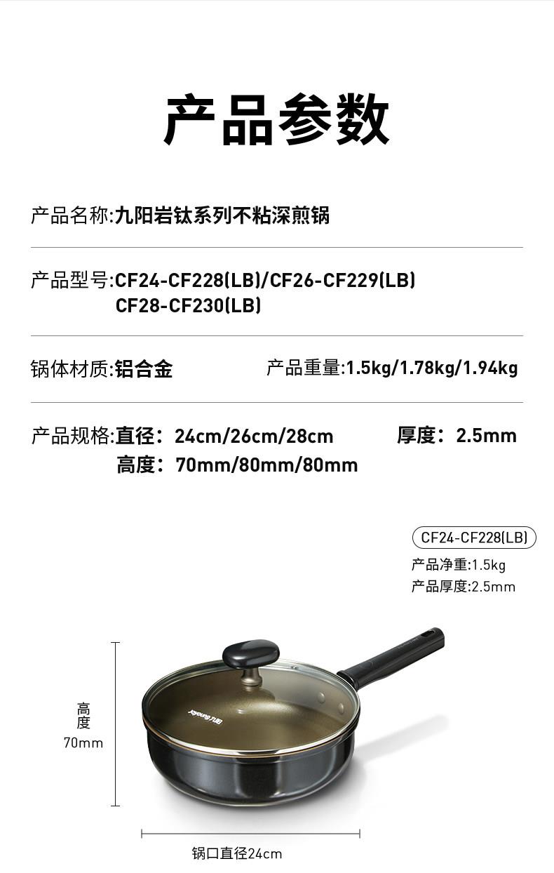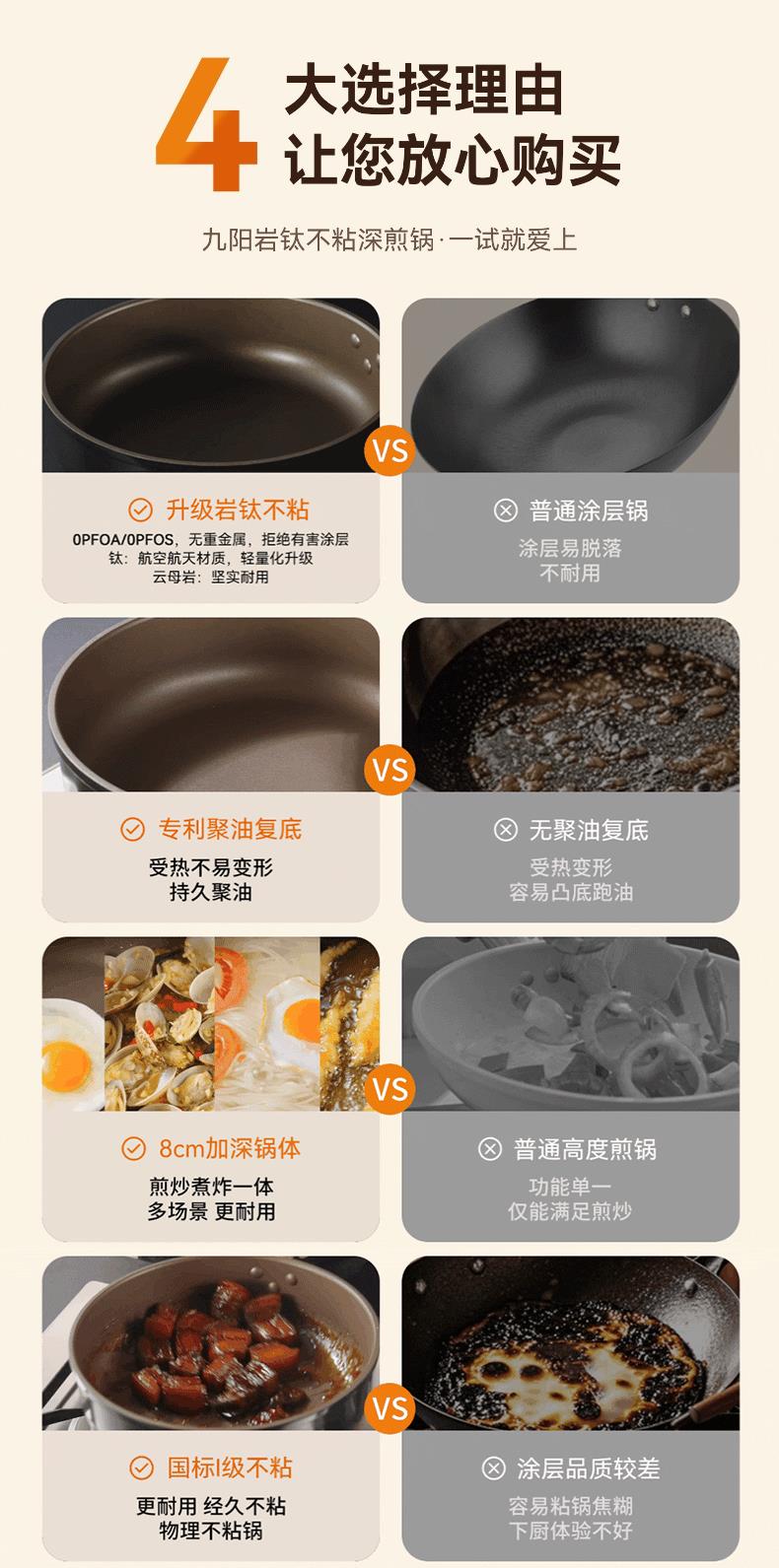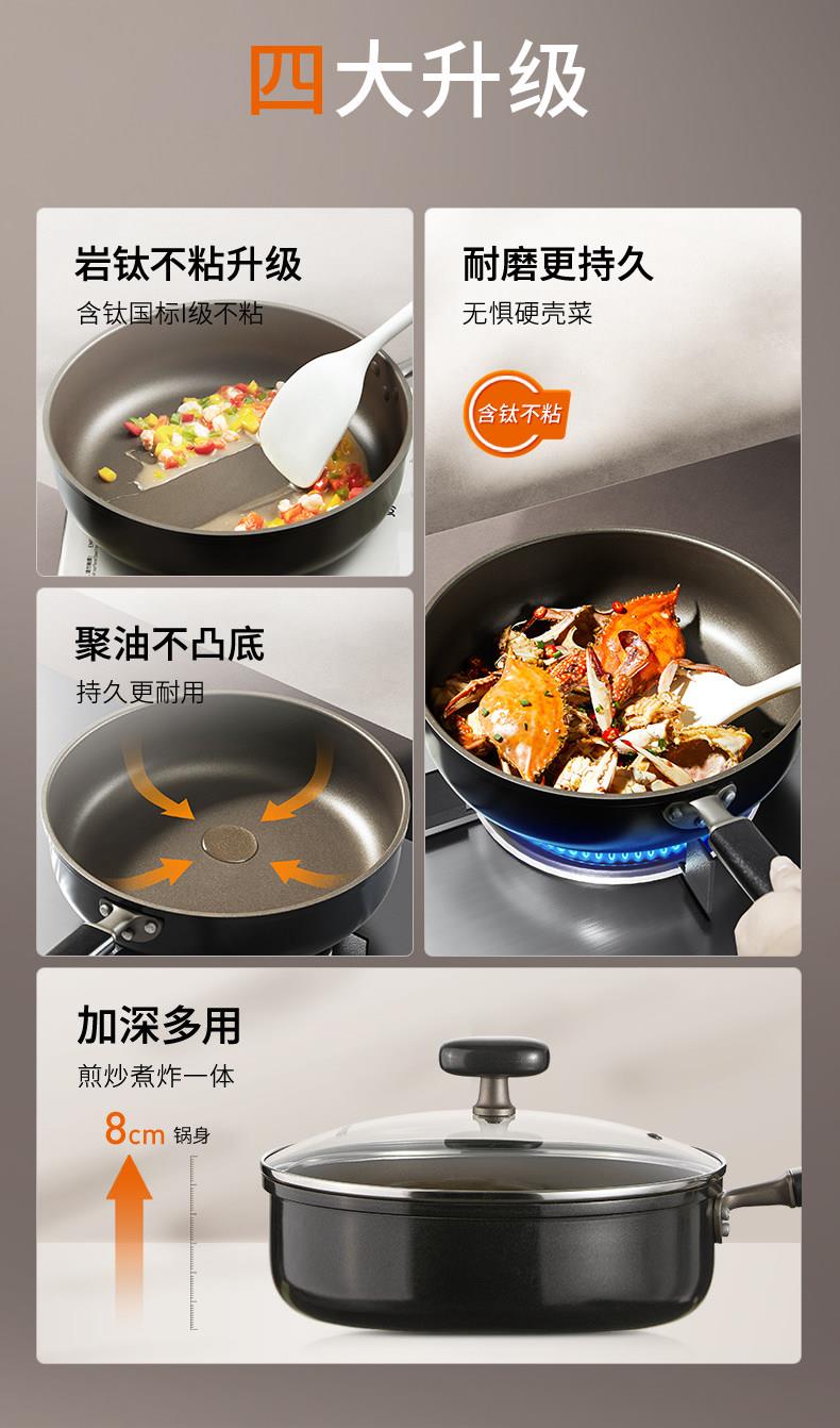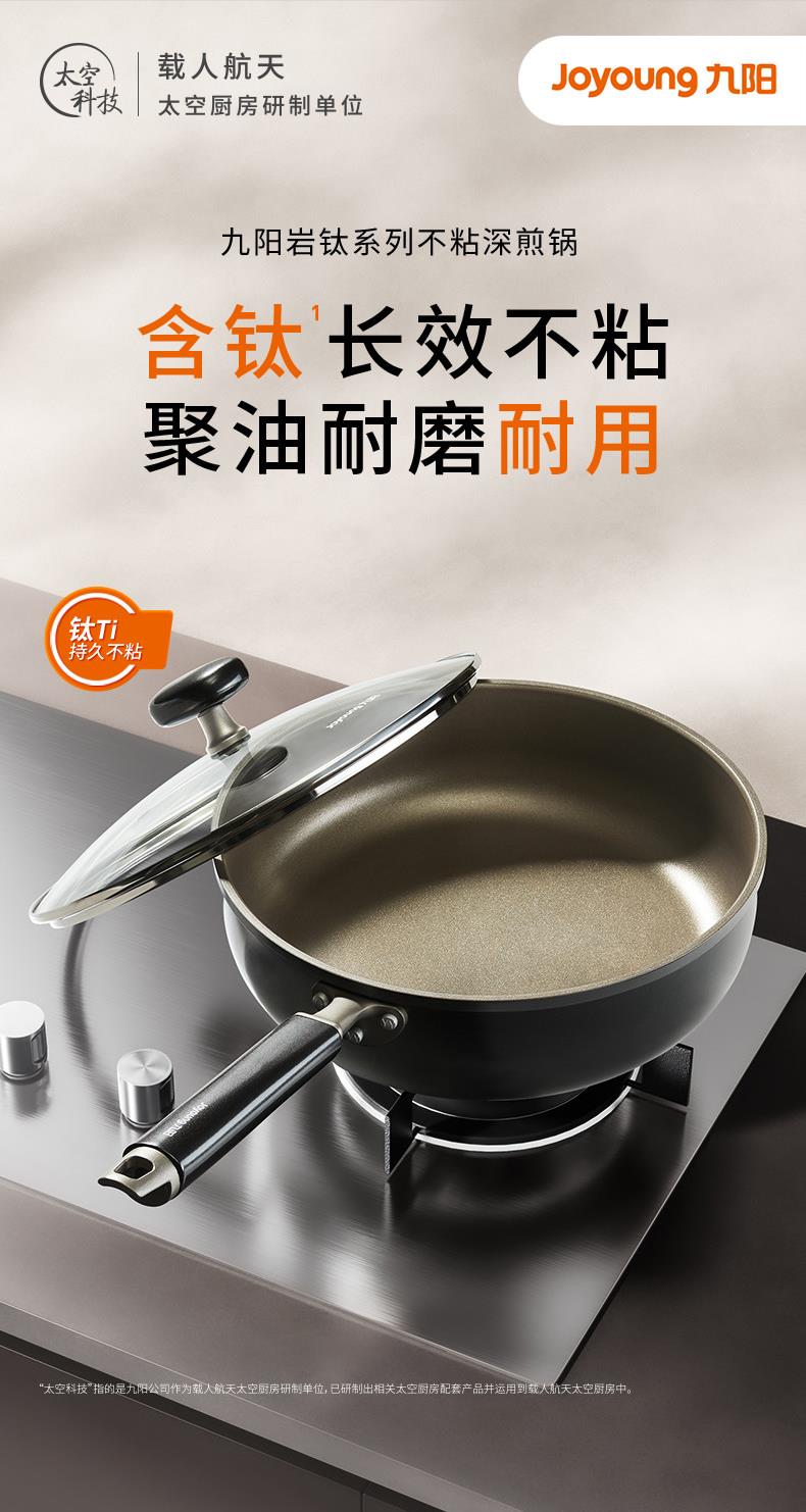 九阳岩钛不粘深煎锅平底锅含钛聚油不粘锅家用煎牛排早餐煎蛋炒锅